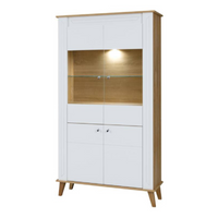 Witryna SANI łączy elegancję z funkcjonalnością. Na mebel składa się 2-drzwiowa szafka z częściowo przeszklonymi drzwiczkami i 2-drzwiowa szafka z pełnymi drzwiczkami.