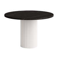 Stół VENTI to elegancki, nowoczesny model z okrągłym blatem w dekorze czarnego marmuru i stabilną białą podstawą, idealny do stylowych wnętrz.