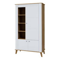 Witryna LENA to funkcjonalny regał z przeszklonymi drzwiczkami, idealny na książki, dekoracje lub kolekcjonerskie przedmioty, które chcesz wyeksponować.