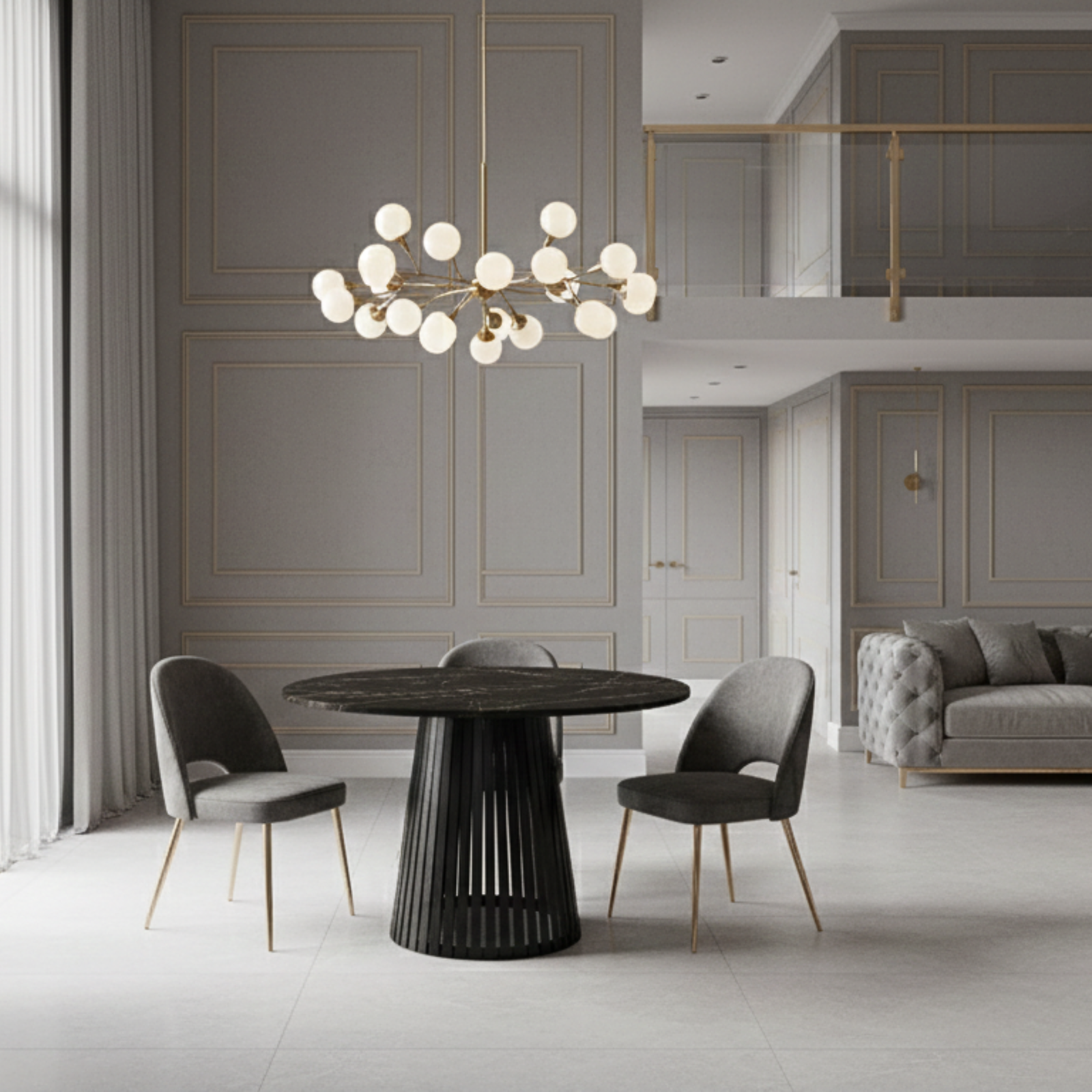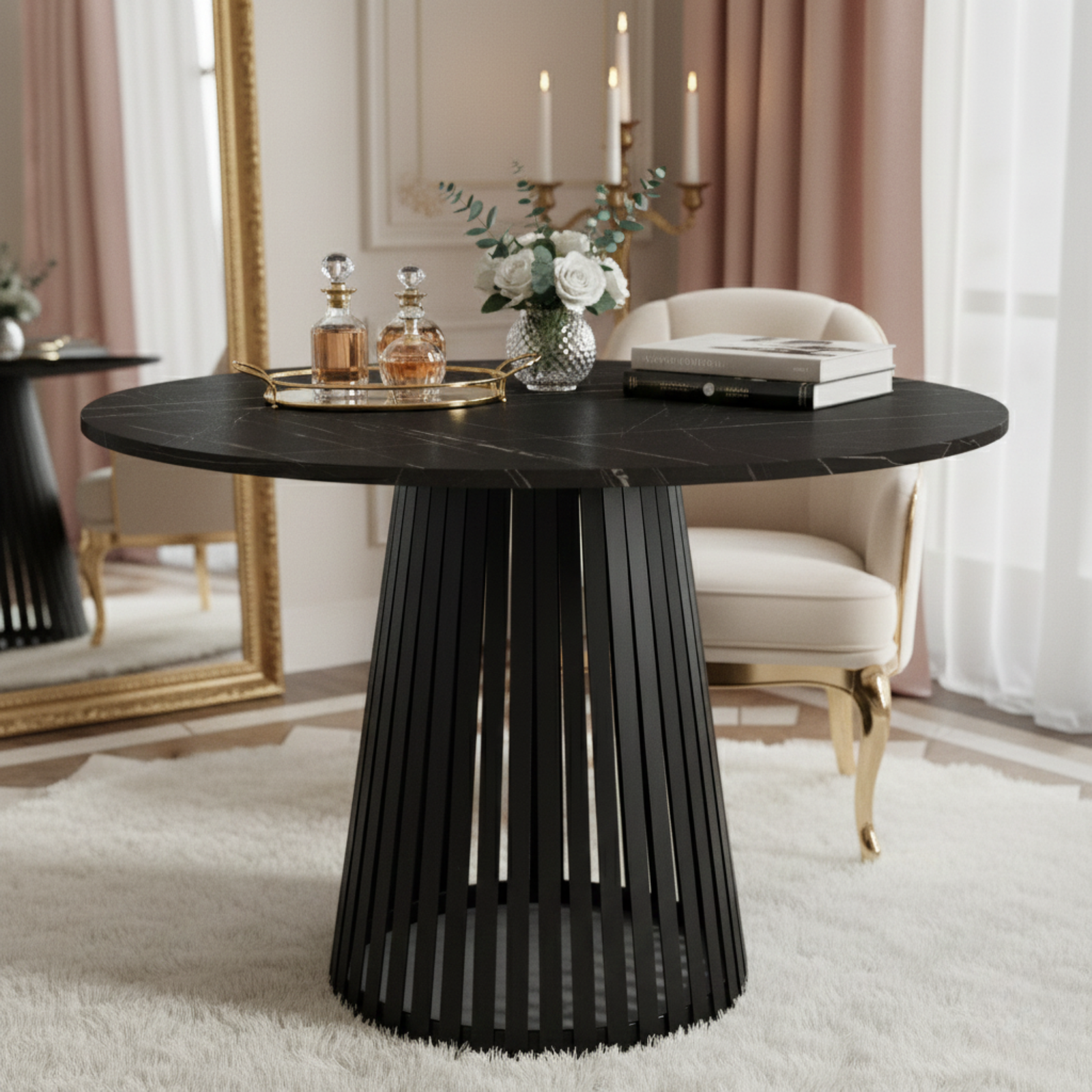 Stół VELORE to elegancki okrągły stół, którego blat w wykończeniu ciemnego marmuru harmonijnie łączy nowoczesny styl z wyrafinowaną estetyką. Jego przemyślany design sprawdzi się zarówno podczas codziennych posiłków, jak i spotkań z bliskimi, wprowadzając do wnętrza wyjątkowy klimat.