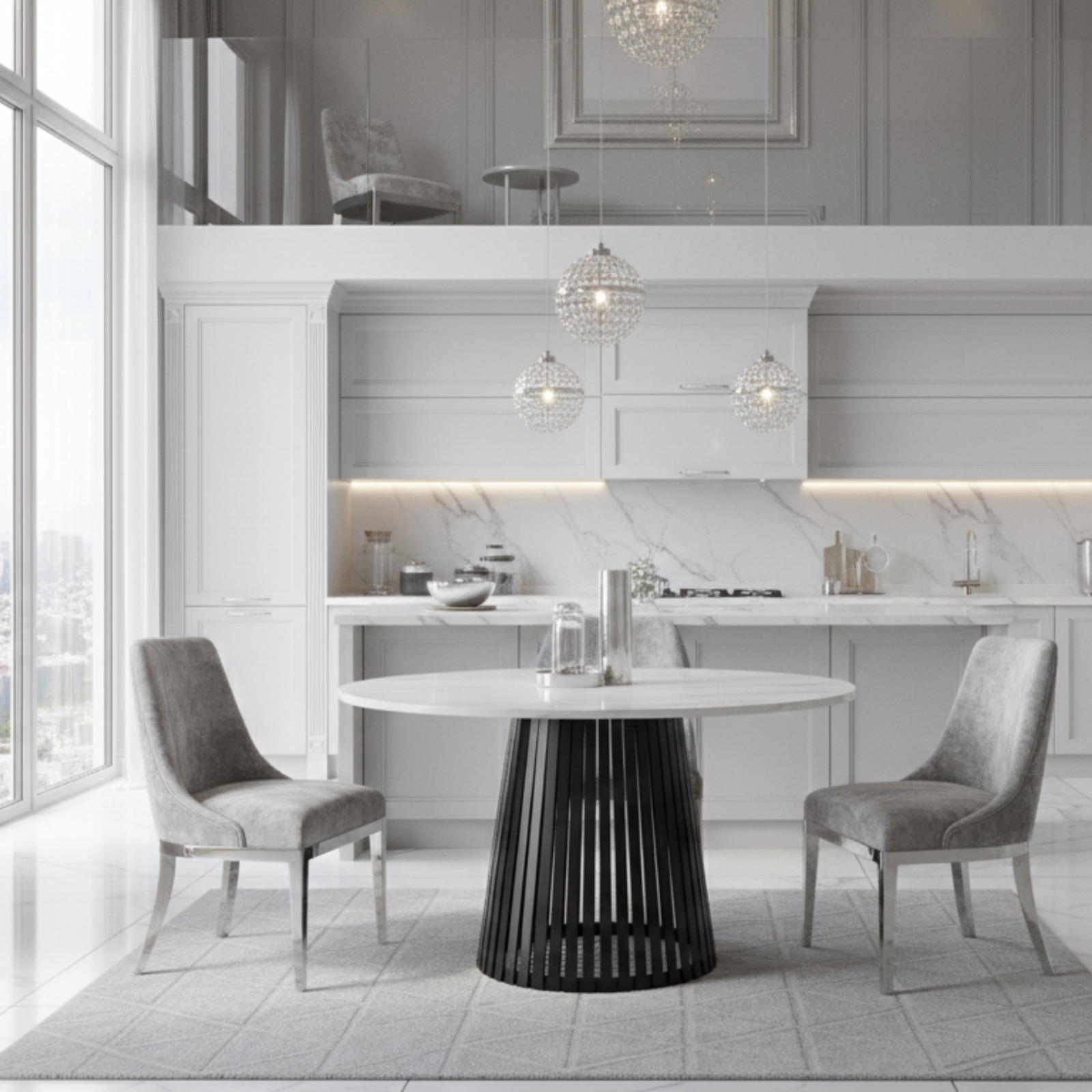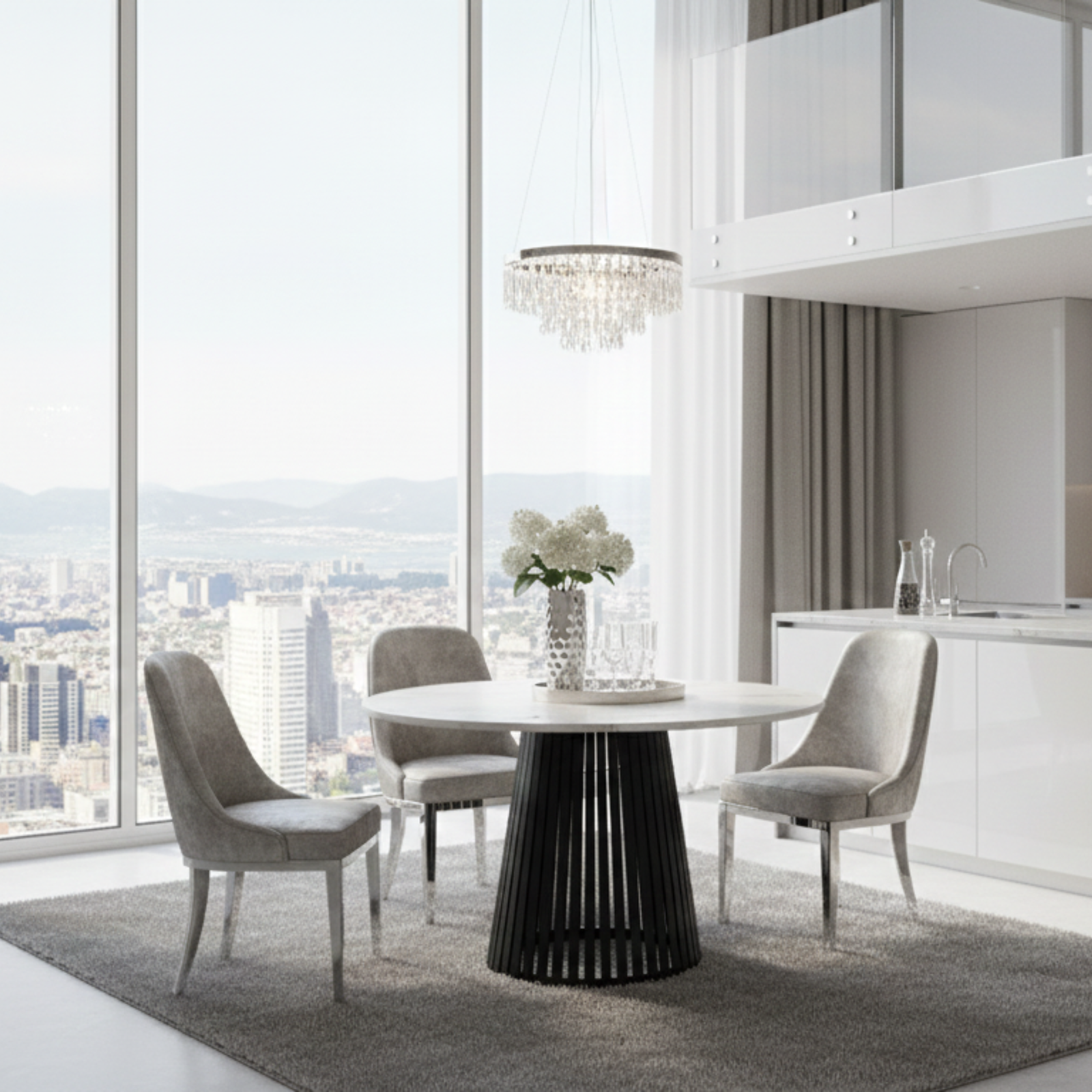VELORE świetnie sprawdzi się zarówno w mniejszych wnętrzach, jak i w przestronnych, otwartych pomieszczeniach. Okrągła forma zapewnia wygodę, tworzy przyjazną atmosferę i jest bezpieczna w użytkowaniu, także przy dzieciach. To idealny stół do codziennych posiłków, spotkań z bliskimi i wspólnego spędzania czasu.