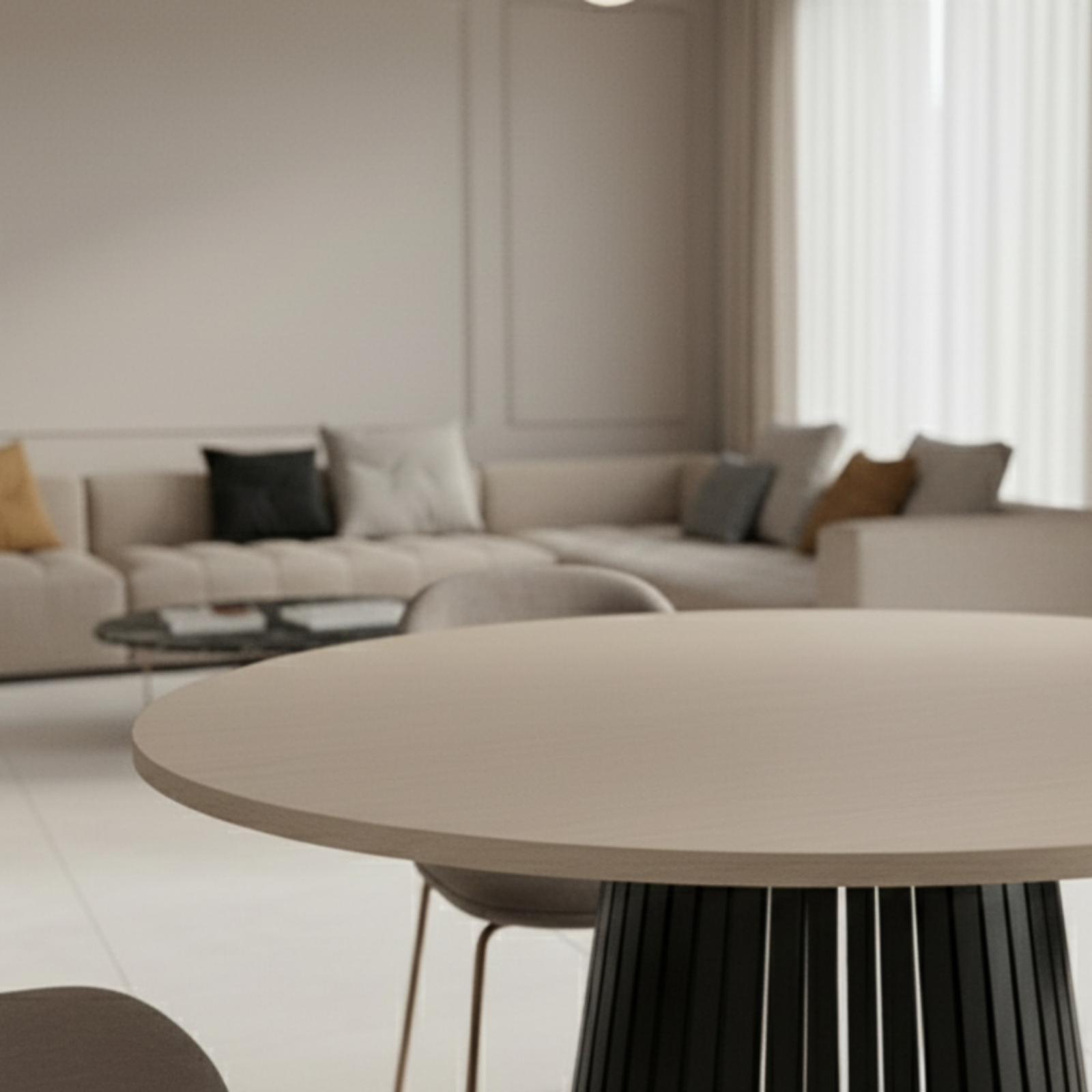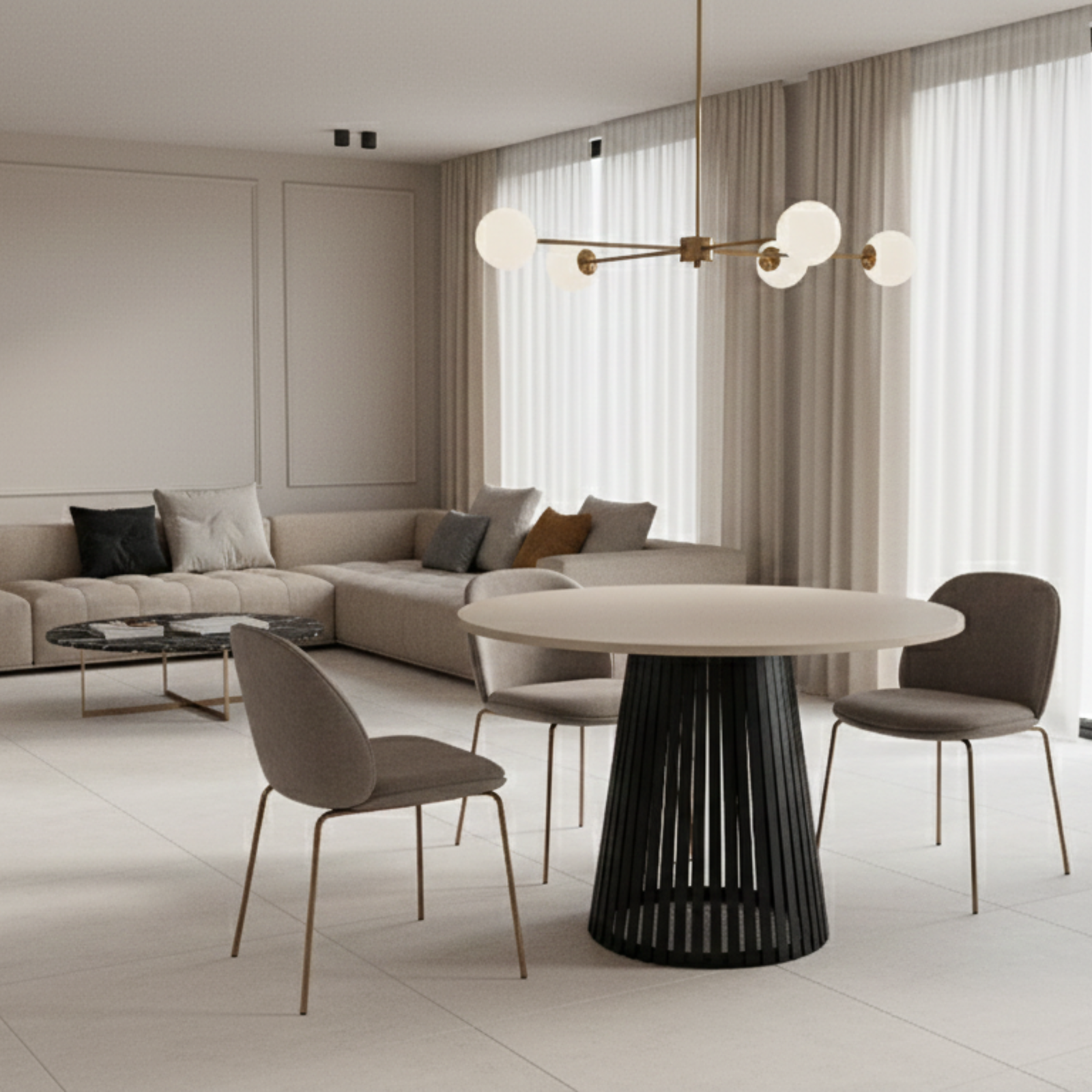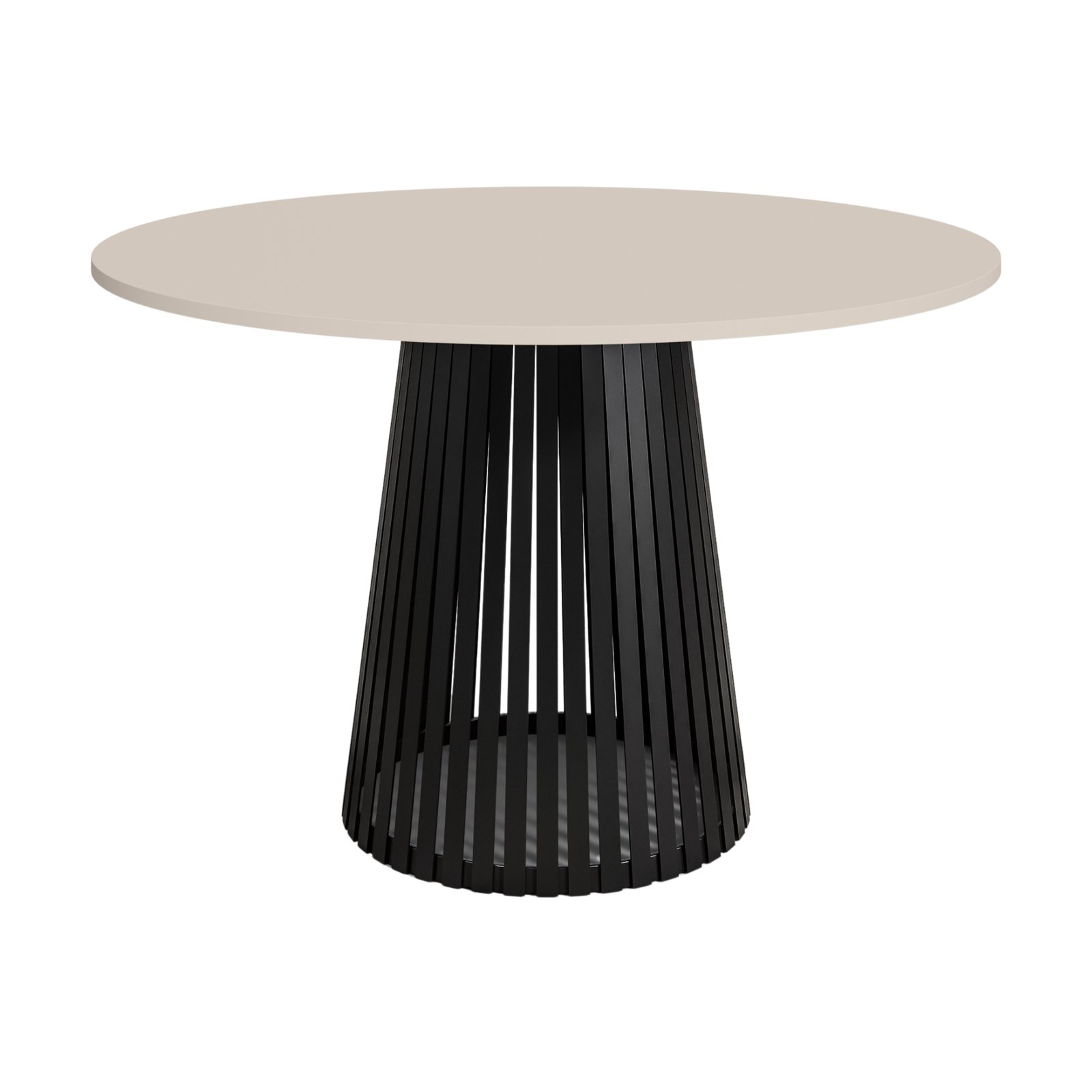 • Stół VELORE to elegancki okrągły stół z czarną metalową nogą i blatem w kolorze kaszmir. Idealnie dopełni nowoczesne wnętrza, oferując trwałość oraz wygodę codziennego użytkowania.