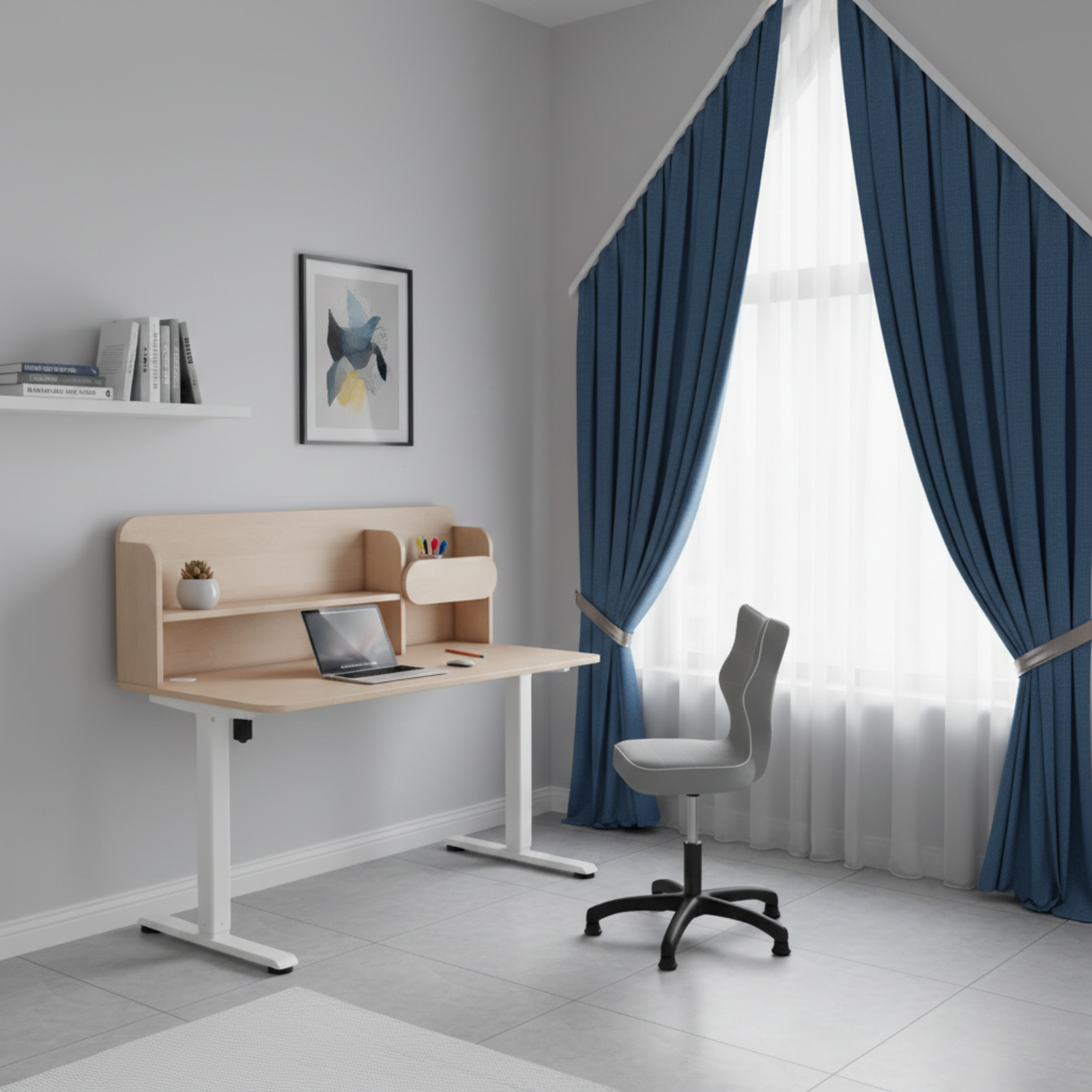Biurko ELISS zostało zaprojektowane specjalnie z myślą o dzieciach i młodzieży. Elektryczna regulacja wysokości pozwala dopasować biurko do wzrostu dziecka na każdym etapie rozwoju. Możliwość zmiany pozycji pomaga utrzymać prawidłową postawę, ogranicza garbienie się oraz wspiera koncentrację podczas nauki, rysowania czy korzystania z komputera.