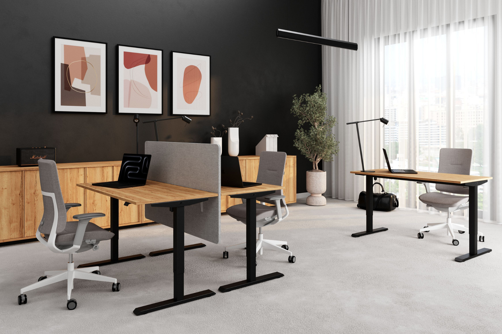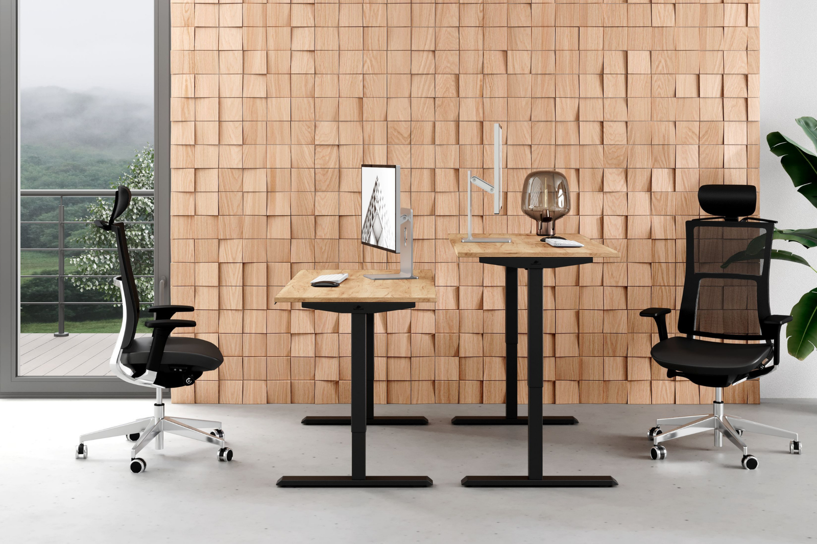 Regulacja wysokości blatu biurka oferuje możliwość idealnego dopasowania mebla to indywidualnych potrzeb i preferencji użytkownika. Dzięki takiemu rozwiązaniu z łatwością można zmienić pozycję z siedzącej na stojącą, co zmniejsza napięcie mięśniowe i poprawia ogólne samopoczucie i koncentrację podczas długich godzin spędzonych przy pracy lub nauce. Stelaż biurka z elektryczną regulacją wysokości blatu wyposażony został w prosty w obsłudze panel sterujący z wyświetlaczem LED pokazującym aktualną wysokość oraz przyciskami „góra” i „dół”, a także przyciskami umożliwiającymi zaprogramowanie dwóch najbardziej komfortowych ustawień wysokości.