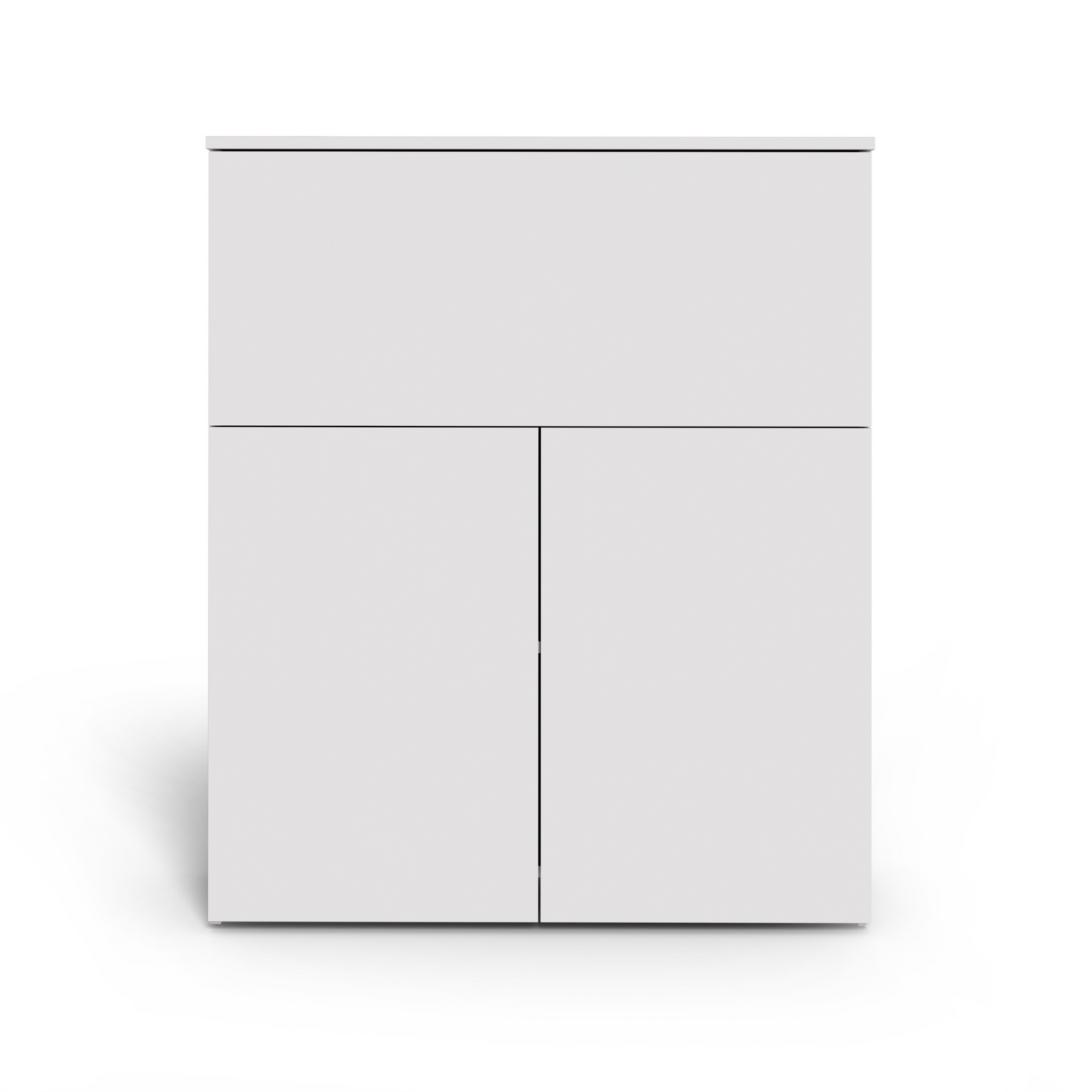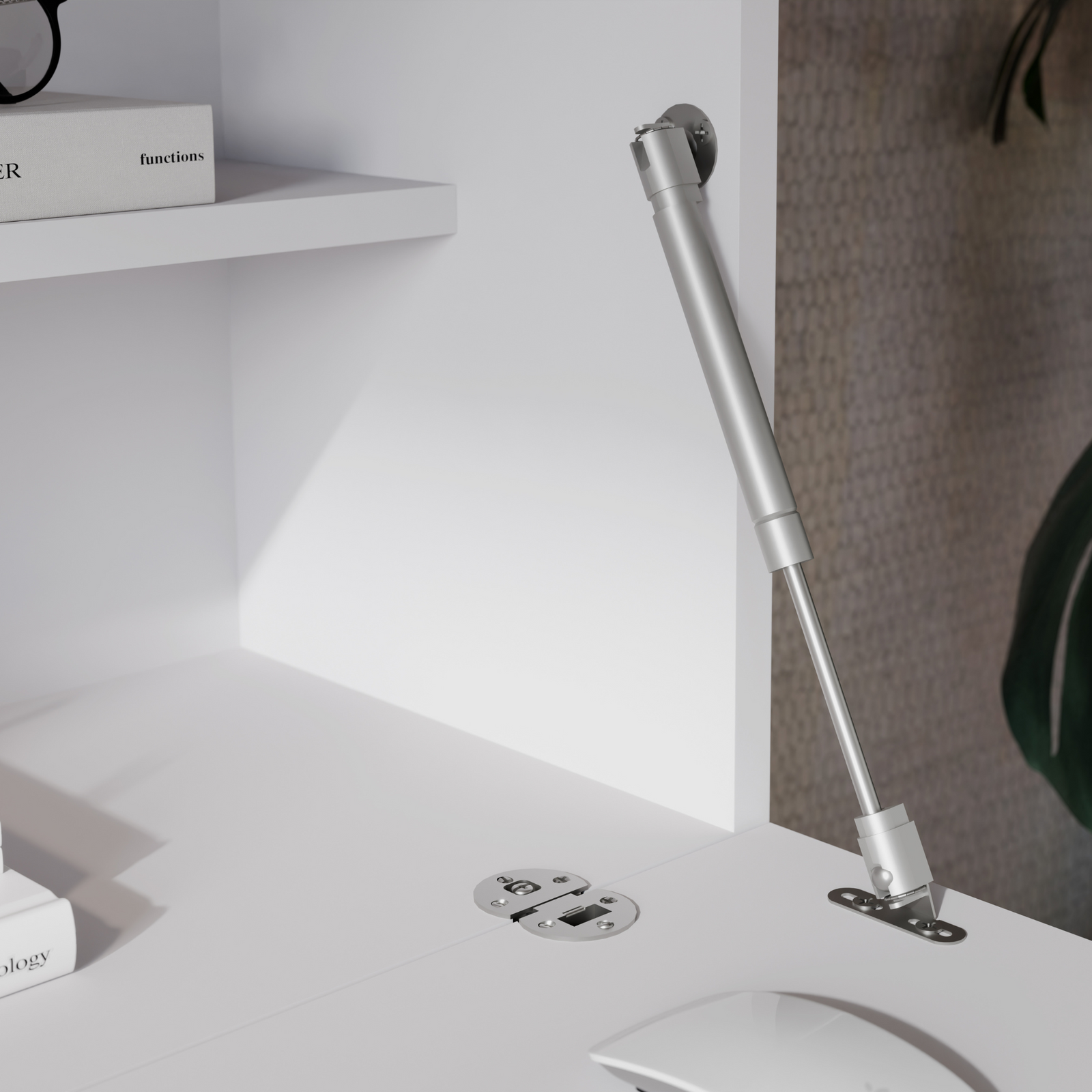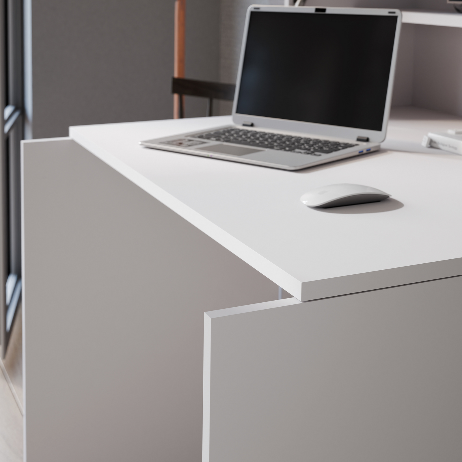 Mebel wykonany został z myślą o codziennym użytkowaniu z wysokiej jakości materiałów i z dbałością o każdy detal. Cała konstrukcja stworzona została z płyty meblowej laminowanej obustronnie o grubości 18mm, co zapewnia trwałość na długie lata. Dla podkreślenia jakości wizualnej, wszystkie krawędzie zostały starannie zabezpieczone obrzeżem PCV/ABS. Bez uchwytowe drzwiczki szafki otwierane są z wykorzystaniem systemu TIP-ON. Górna część drzwiczek otwierana jest w dół przy pomocy siłowników. W dolnej części szafki, do dwudrzwiowych frontów otwieranych na zawiasach zamocowano dodatkowe kółeczka na dole, które nie tylko ułatwiają otwieranie, ale stanowią dodatkowe podparcie i stabilność dla blatu biurka. Dobrze przemyślana, solidna konstrukcja mebla gwarantuje jego stabilność. Biurko VETRO to inwestycja w wygodę i estetykę domowej przestrzeni.