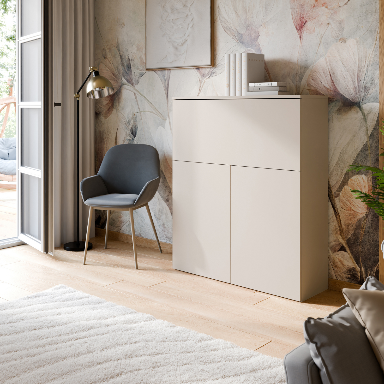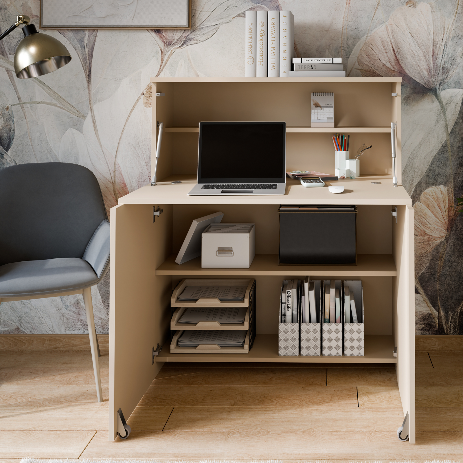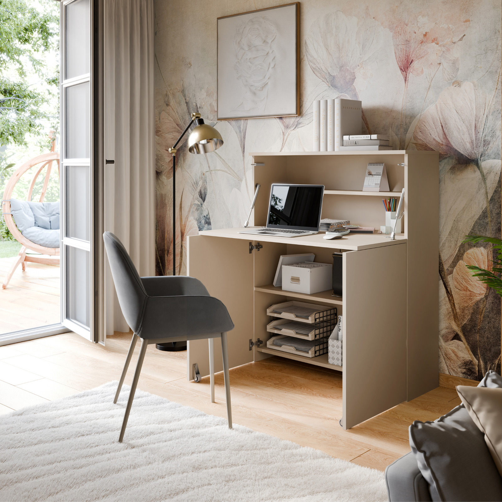 Biurko VERTO to idealne rozwiązanie - w kilka sekund możesz rozłożyć swoje mini biuro i równie szybko je schować, kiedy nie jest potrzebne. Po rozłożeniu biurko oferuje w pełni wyposażone miejsce do pracy lub nauki z wbudowanymi półkami. Szeroki blat umożliwia bardzo komfortową pracę przy biurku. Duży blat pozwala na wygodne ustawienie laptopa, a także rozłożenie dokumentów, książek czy zeszytów. Konstrukcja mebla z wbudowanymi półkami sprawia, że biurko jest idealnie przystosowane do przechowywania niezbędnych do pracy i nauki rzeczy i akcesoriów biurowych, tak by znajdowały się one zawsze pod ręką.