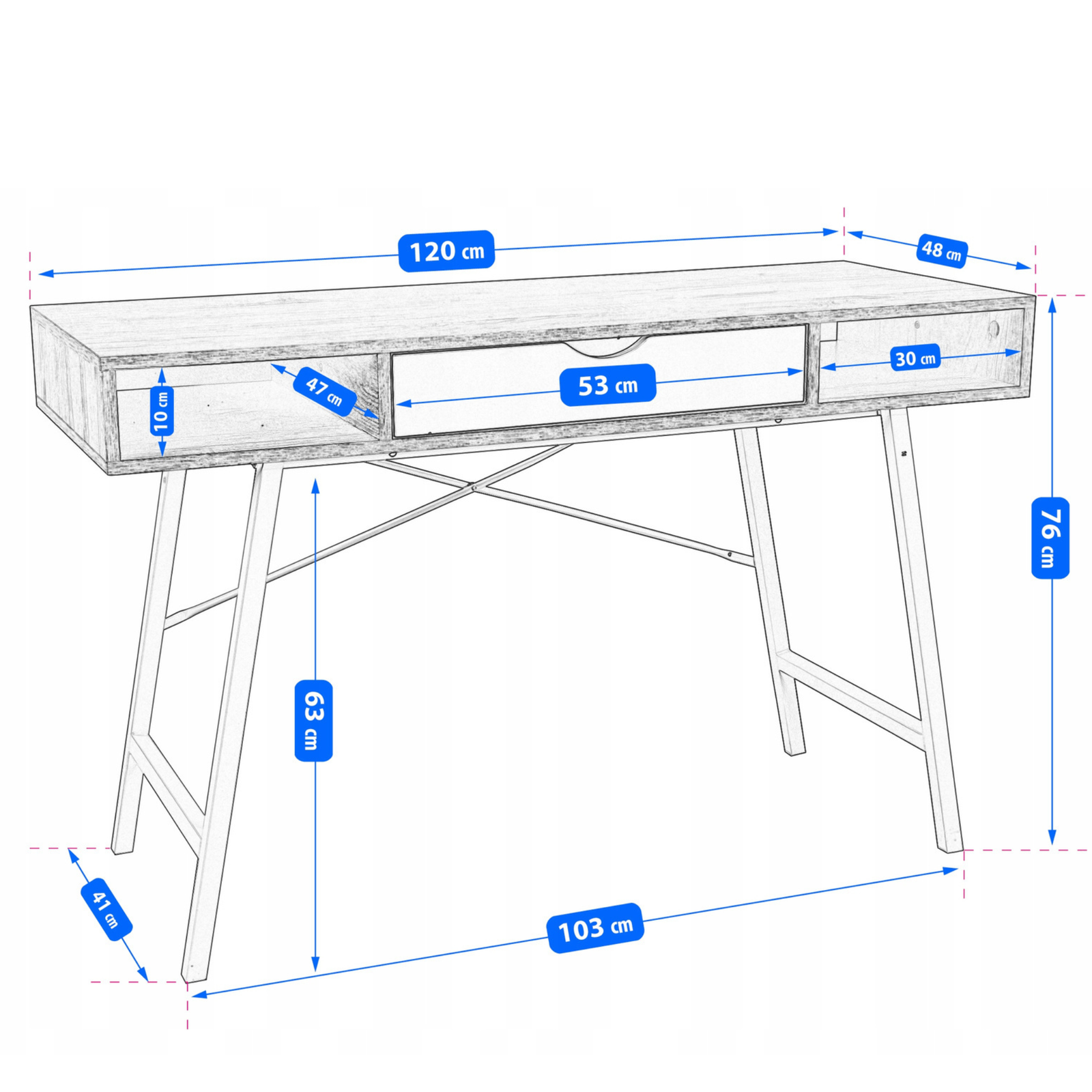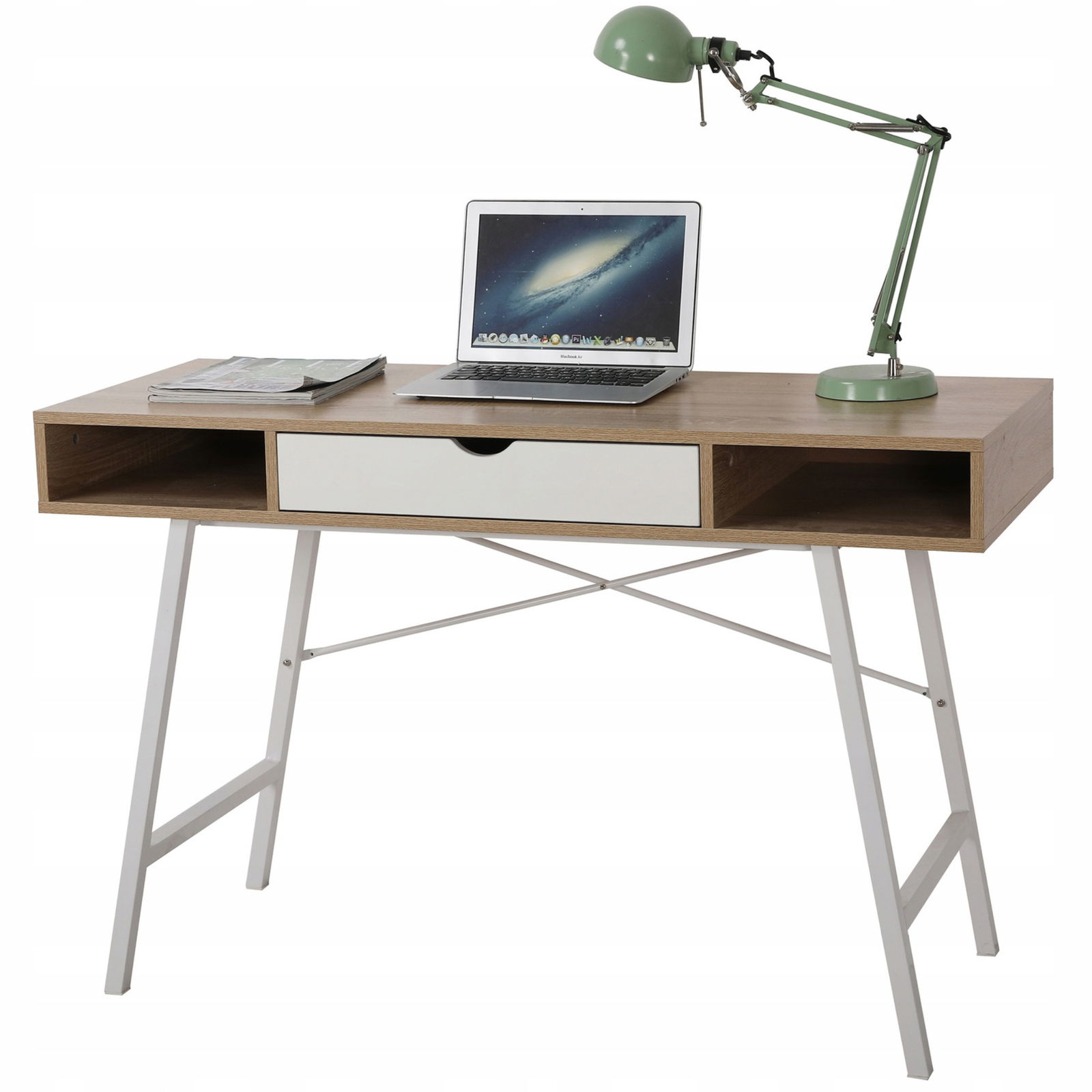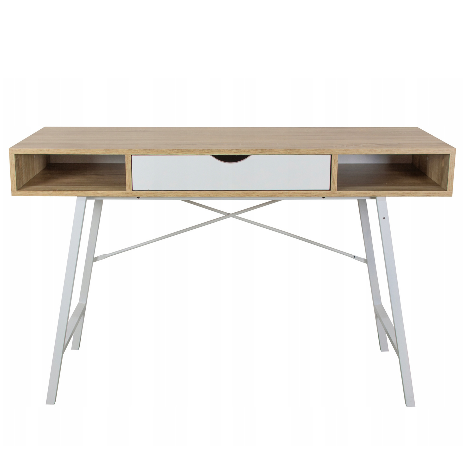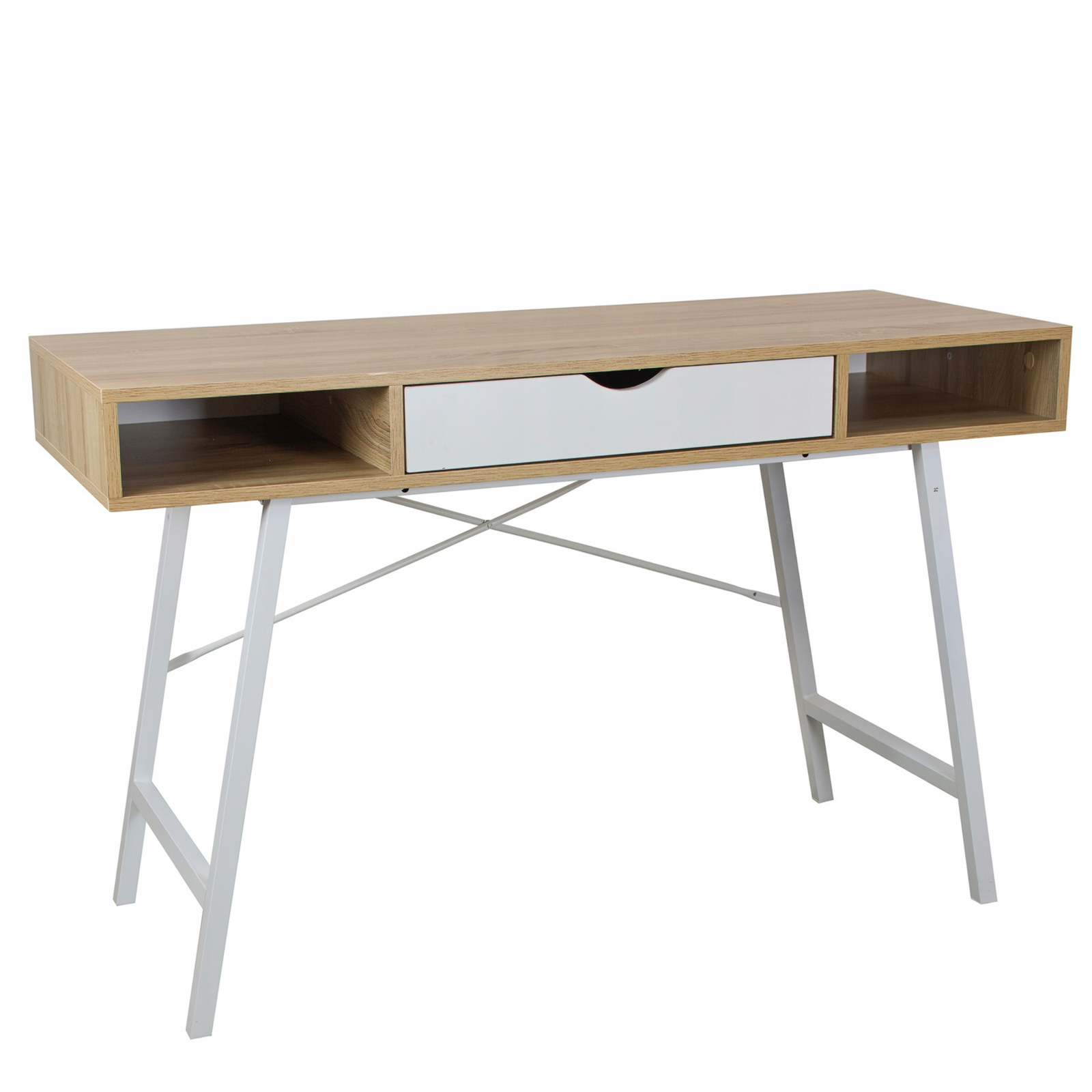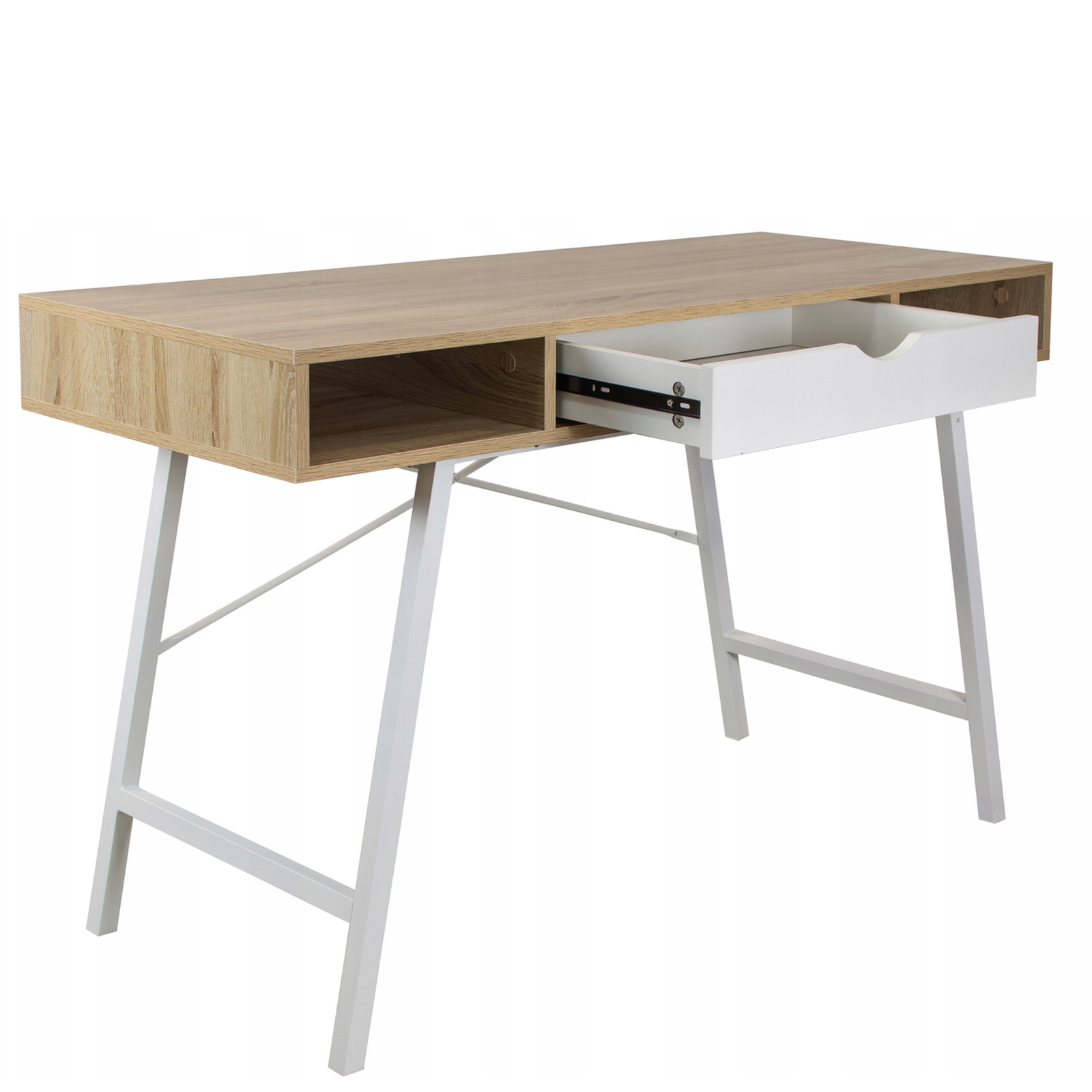 Model TAVIO został zaprojektowany z myślą o maksymalnej wygodzie i ergonomii. Pojemna szuflada oraz dwie otwarte półki pozwalają na wygodne przechowywanie dokumentów, przyborów biurowych i akcesoriów, dzięki czemu wszystko, czego potrzebujesz, jest zawsze pod ręką. Szeroki blat roboczy zapewnia przestrzeń do pracy z komputerem, nauki lub tworzenia projektów, a gładka powierzchnia jest łatwa w utrzymaniu czystości. Nowoczesny charakter biurka podkreślają subtelne detale, takie jak wycięcie w szufladzie pełniące funkcję uchwytu oraz smukłe, białe nogi o stabilnej konstrukcji.