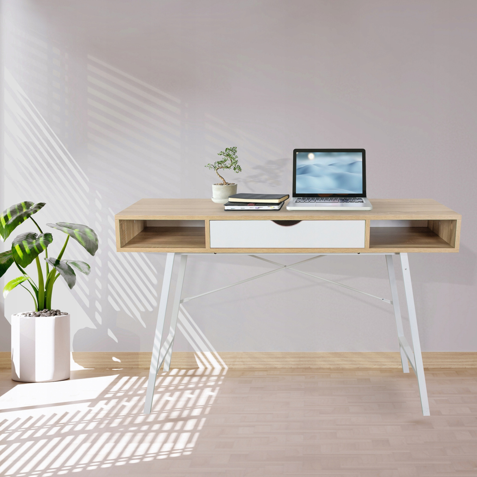 Biurko TAVIO to doskonałe połączenie stylu, prostoty i wygody, które sprawdzi się w każdym nowoczesnym wnętrzu. Jego lekka, minimalistyczna konstrukcja oraz zestawienie bieli z naturalnym odcieniem drewna wprowadzą do pomieszczenia harmonię i świeżość. Biurko TAVIO to propozycja dla osób, które cenią design, funkcjonalność i porządek w jednym.