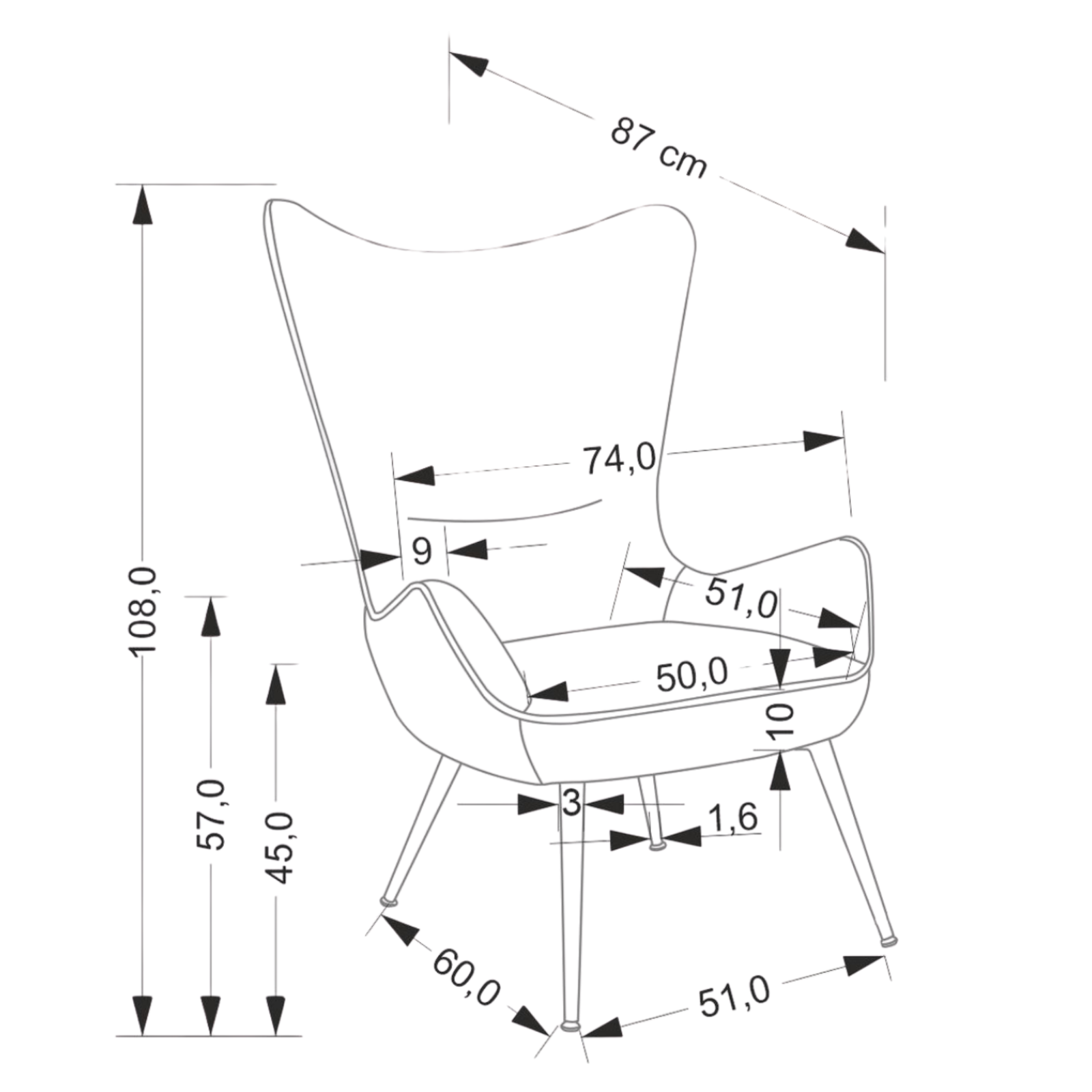 Szerokość: 74 cm, głębokość: 87 cm, wysokość: 108 cm, wysokość siedziska: 45 cm. - Z jakiego materiału wykonane jest obicie?