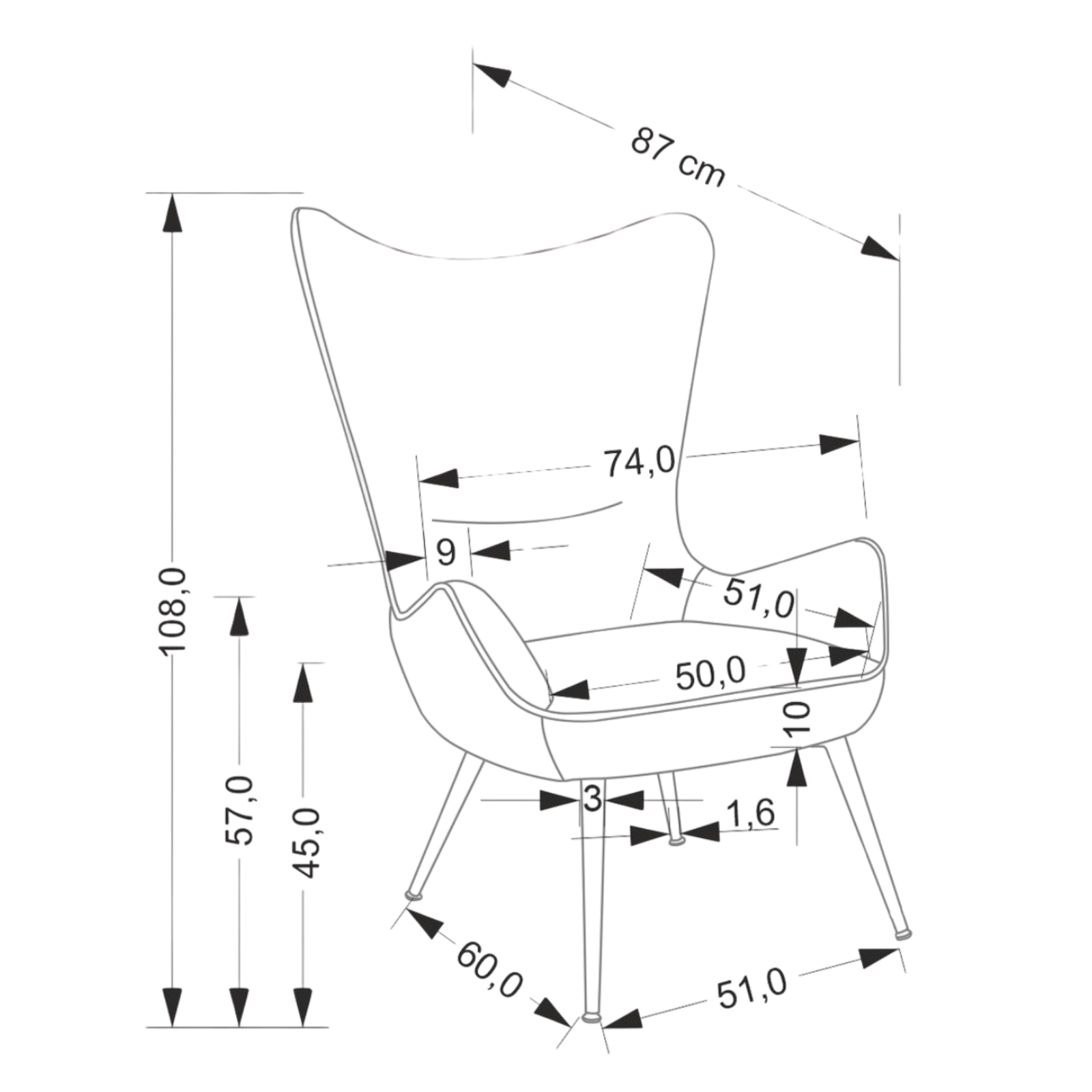 Szerokość: 74 cm, głębokość: 87 cm, wysokość: 108 cm, wysokość siedziska: 45 cm. - Z jakiego materiału wykonane jest obicie?