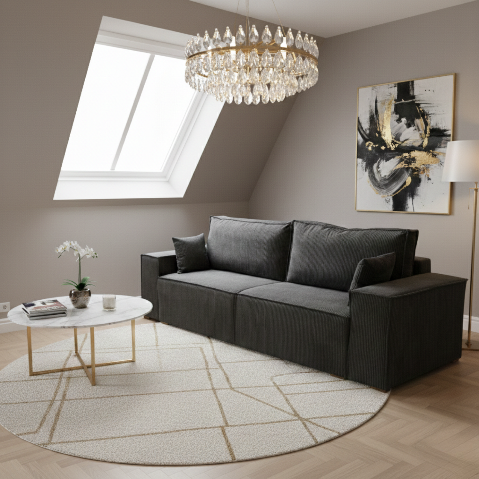 Kanapa CELESTIA to harmonijne połączenie współczesnego wzornictwa, wygody i eleganckiego wykończenia. W ciągu dnia doskonale sprawdzi się jako komfortowe miejsce relaksu oraz spotkań z rodziną i gośćmi. Wieczorem z łatwością zamienia się w przestronne łóżko, zapewniając komfortowy sen i pełną regenerację po intensywnym dniu.
