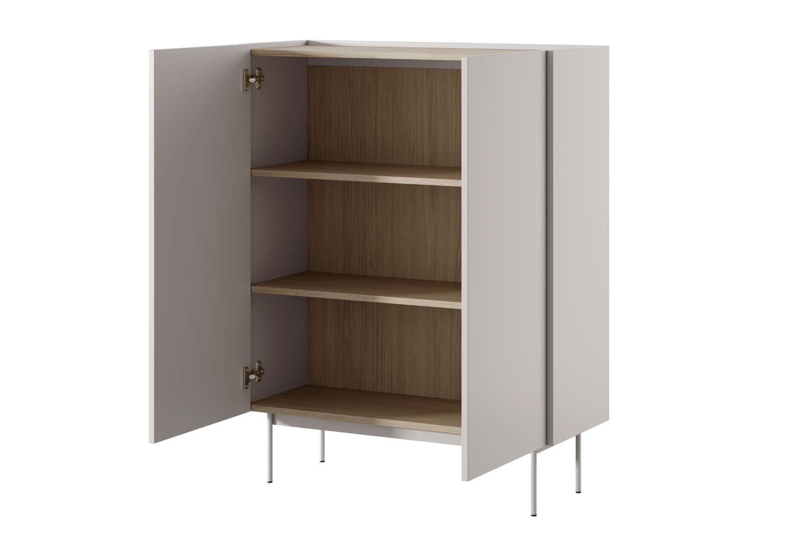 Wysoka komoda COLETTE została zaprojektowana z myślą o praktycznym przechowywaniu i estetyce. Pojemne półki pomieszczą ubrania, tekstylia, dokumenty lub inne domowe akcesoria, pomagając utrzymać porządek w salonie, sypialni lub gabinecie. Górny blat idealnie nadaje się do wyeksponowania dekoracji, kwiatów czy ramek ze zdjęciami, dodając wnętrzu indywidualnego stylu. Dzięki solidnej konstrukcji i metalowym nóżkom komoda jest stabilna, a jednocześnie prezentuje się lekko i nowocześnie.
