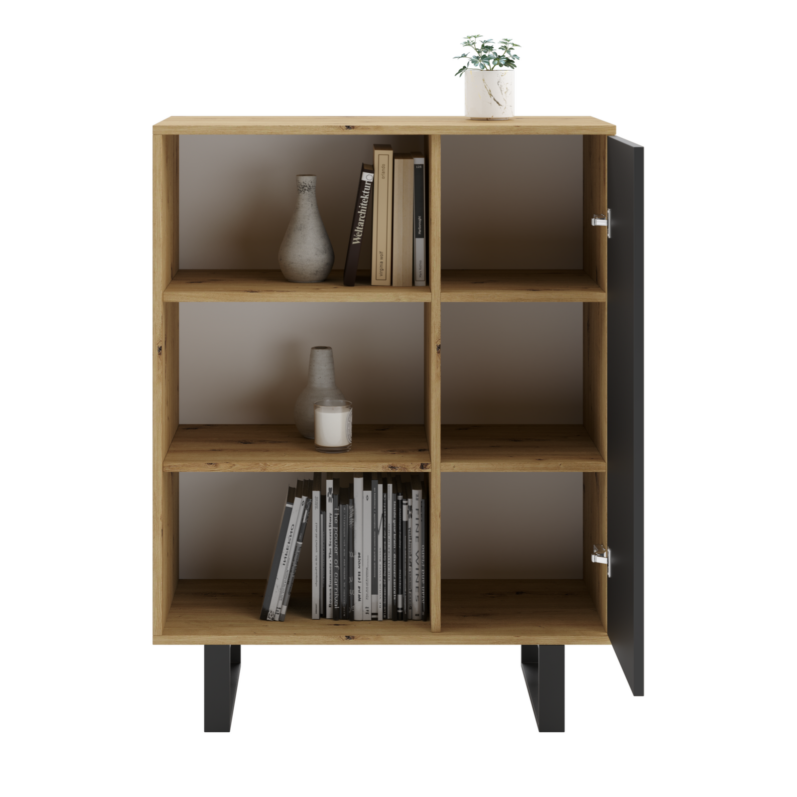 Komoda FONDI to idealna opcja dla osób, które poszukują połączenia eleganckiego designu z praktycznością. Model FONDI przykuwa wzrok swym nowoczesnym wyglądem, prostą formą i modną kolorystyką, wpasowując się zarówno we współczesne, jak i te bardziej klasyczne aranżacje wnętrz. Dzięki połączeniu szafki z regałem, mebel ten będzie doskonałym wyborem zarówno do pomieszczeń domowych, jak i przestrzeni biurowych. Czarne metalowe nogi nadają komodzie charakteru i podkreślają loftowy styl.