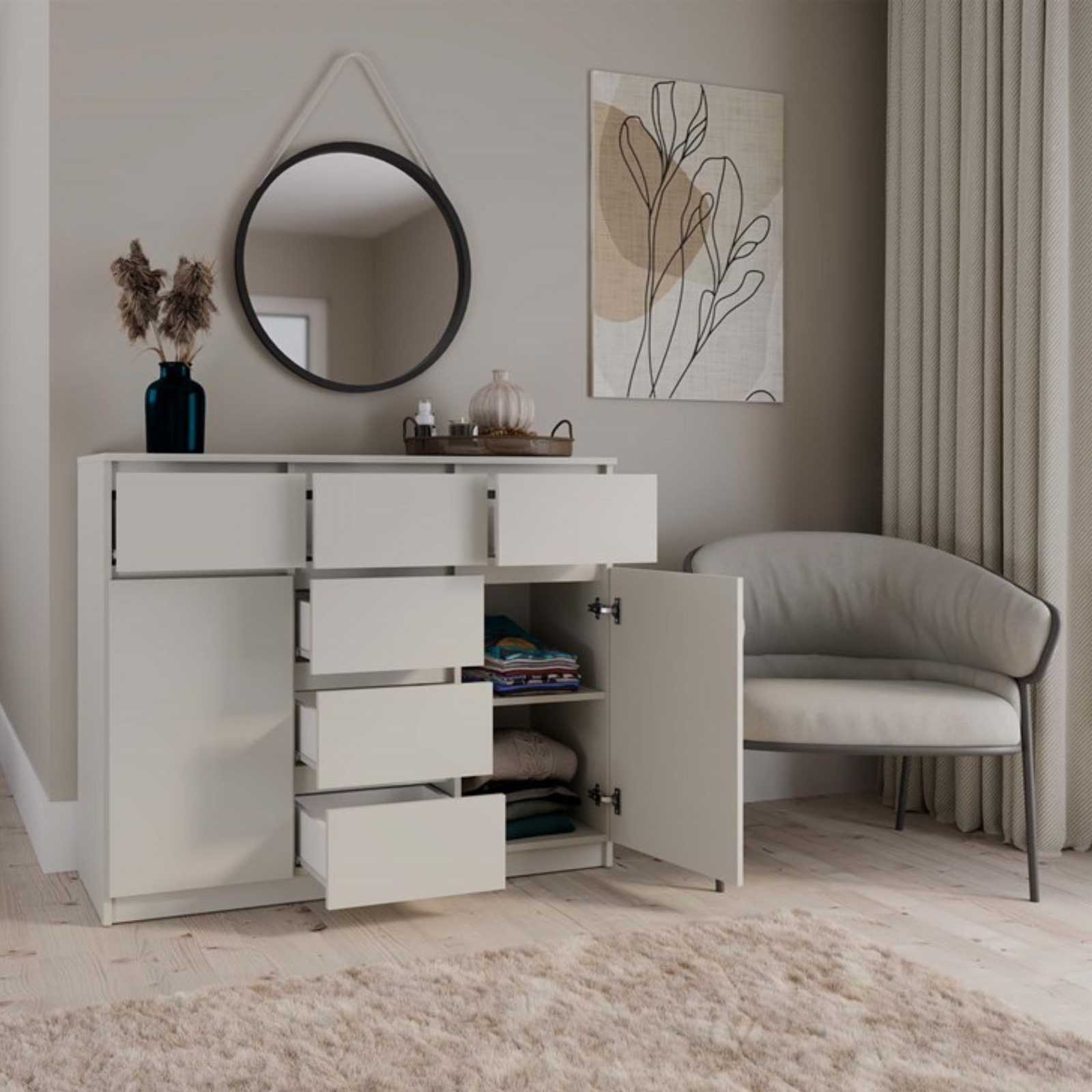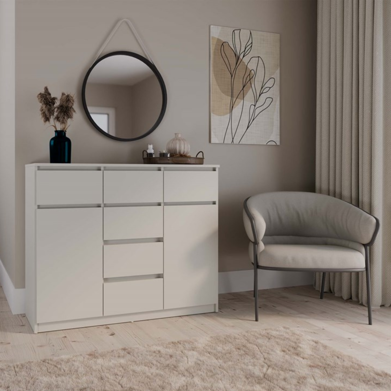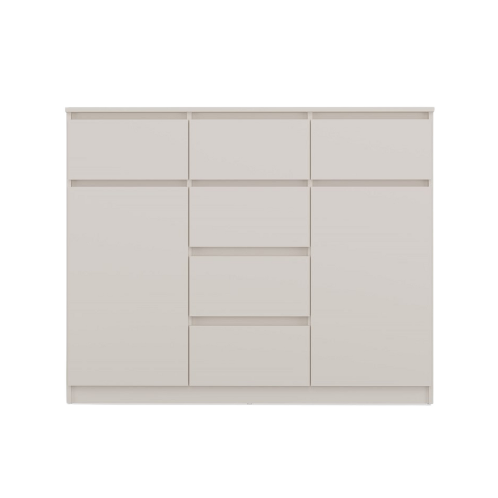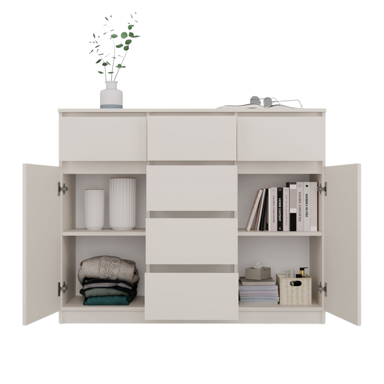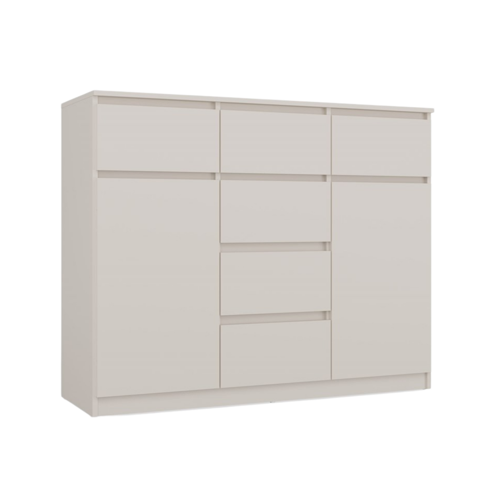 Komoda MALMO wyposażona została w dwie jednodrzwiowe szafki i aż sześć szuflad. To idealna propozycja dla osób, które cenią nowoczesny design i prostotę. Zaprojektowana z myślą o maksymalnej funkcjonalności, oferuje przestronną przestrzeń do przechowywania, jednocześnie stanowiąc stylową ozdobę wnętrza. Uniwersalna komoda z delikatnym nowoczesnym wyglądem świetnie komponuje się zarówno w nowoczesnych, jak i bardziej klasycznych aranżacjach.