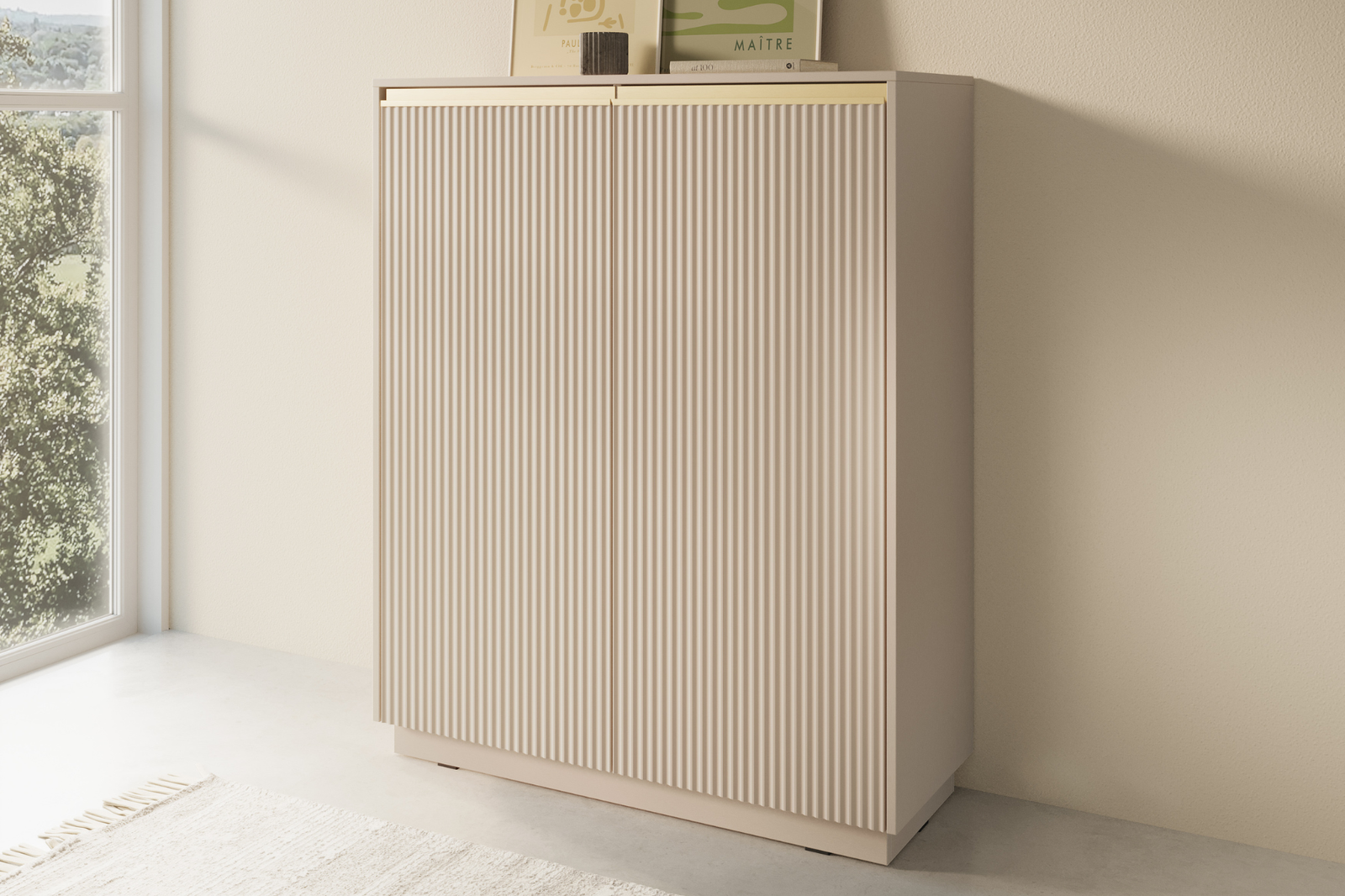 Komoda PRESTIGE to wyjątkowy mebel stworzony z myślą o miłośnikach nowoczesnych wnętrz, którzy cenią styl, jakość i funkcjonalność. Beżowe wykończenie ze złotymi akcentami nadaje jej wyrafinowanego charakteru, a frezowane fronty z płyty MDF tworzą elegancki i unikalny efekt wizualny. Wysoka konstrukcja komody przyciąga wzrok i doskonale podkreśla aranżacje w stylu glamour, nowoczesnym lub loftowym. To mebel, który nie tylko ozdobi przestrzeń, ale także doda jej klasy i harmonii.