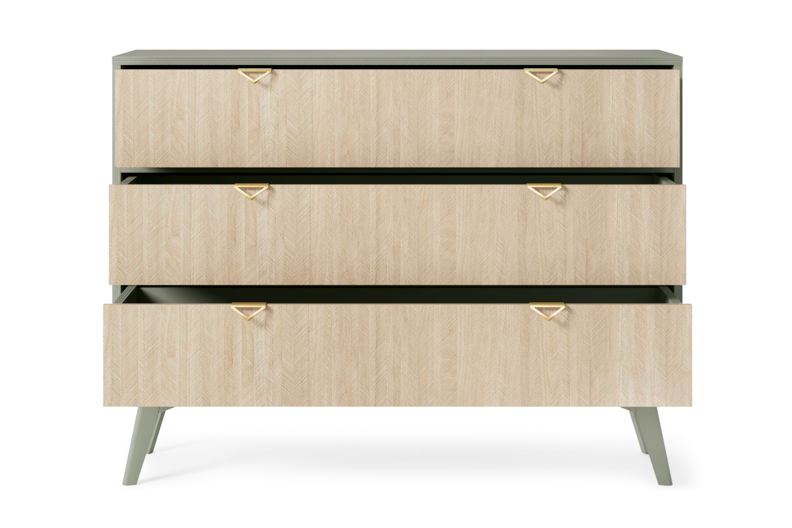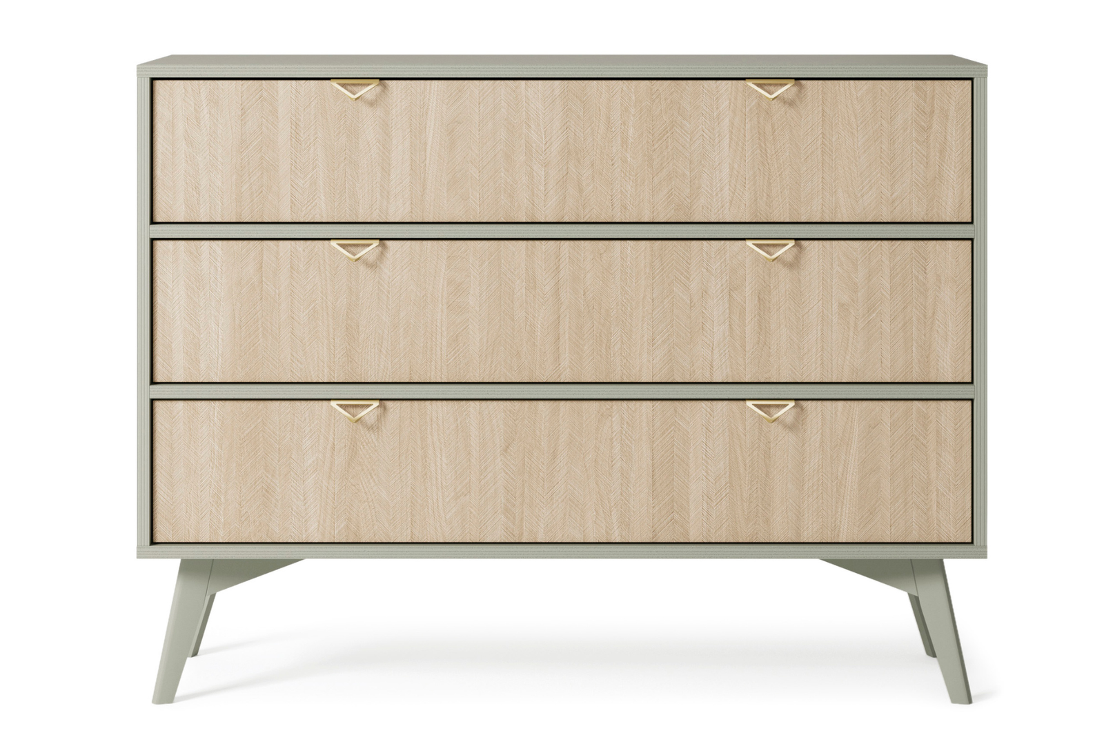 Komoda VINORA to kompaktowy i stylowy mebel w klimacie boho, łączący subtelną zieleń eukaliptusa z dekoracyjnym wzorem jodełki scandi. Jej niewielki rozmiar czyni ją idealną do mniejszych przestrzeni, a głębokie szuflady zapewniają doskonałą funkcjonalność. Matowe wykończenie i eleganckie złote detale dodają wnętrzom charakteru i harmonii.
