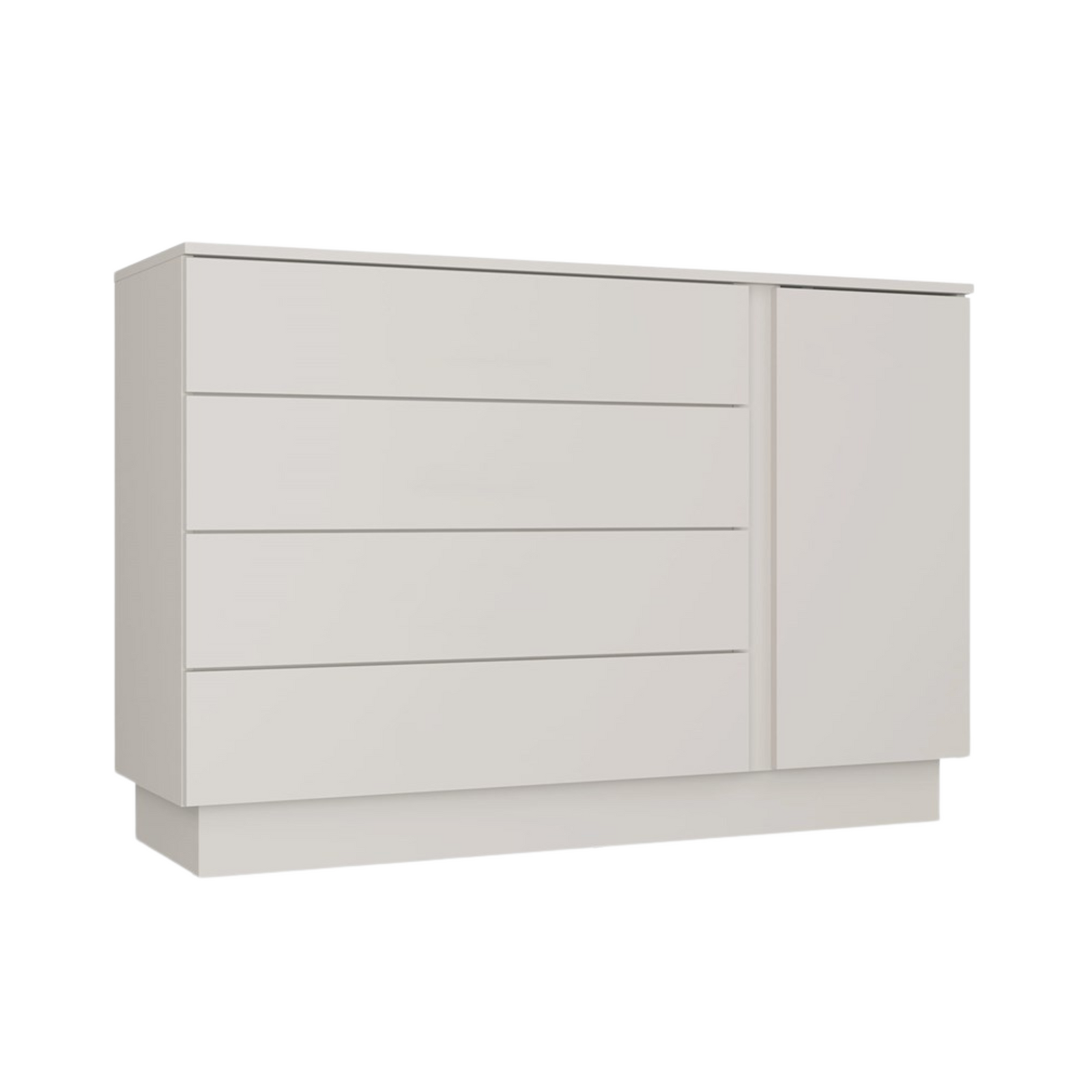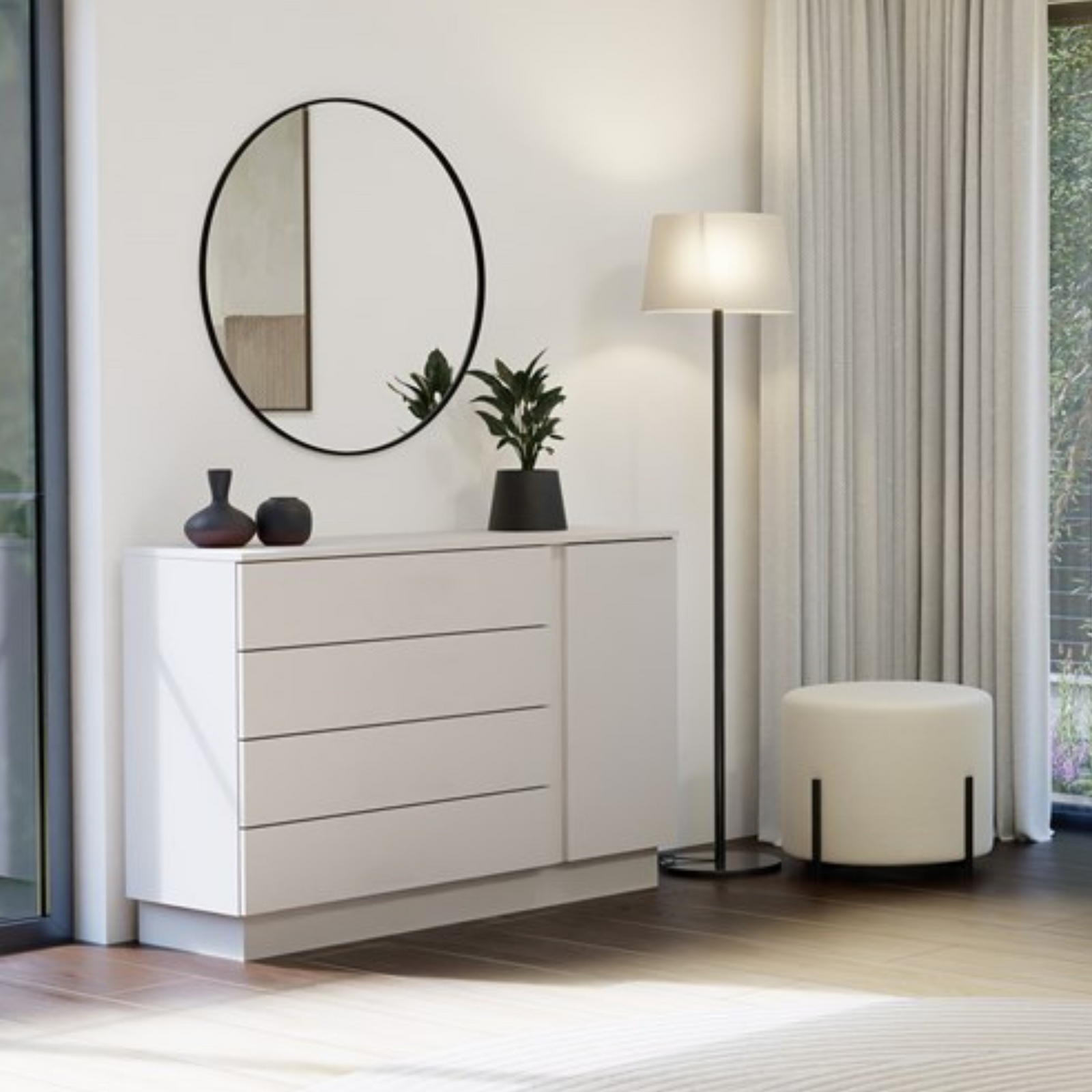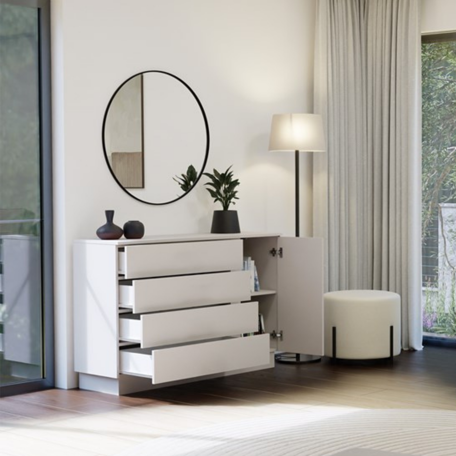 Komoda ZAMBER wyposażona została w jednodrzwiową szafkę oraz aż cztery szuflady. To idealna propozycja dla osób, które cenią nowoczesny design i prostotę. Zaprojektowana z myślą o maksymalnej funkcjonalności, oferuje przestronną przestrzeń do przechowywania, jednocześnie stanowiąc stylową ozdobę wnętrza. Uniwersalna komoda z delikatnym nowoczesnym wyglądem świetnie komponuje się zarówno w nowoczesnych, jak i bardziej klasycznych aranżacjach.