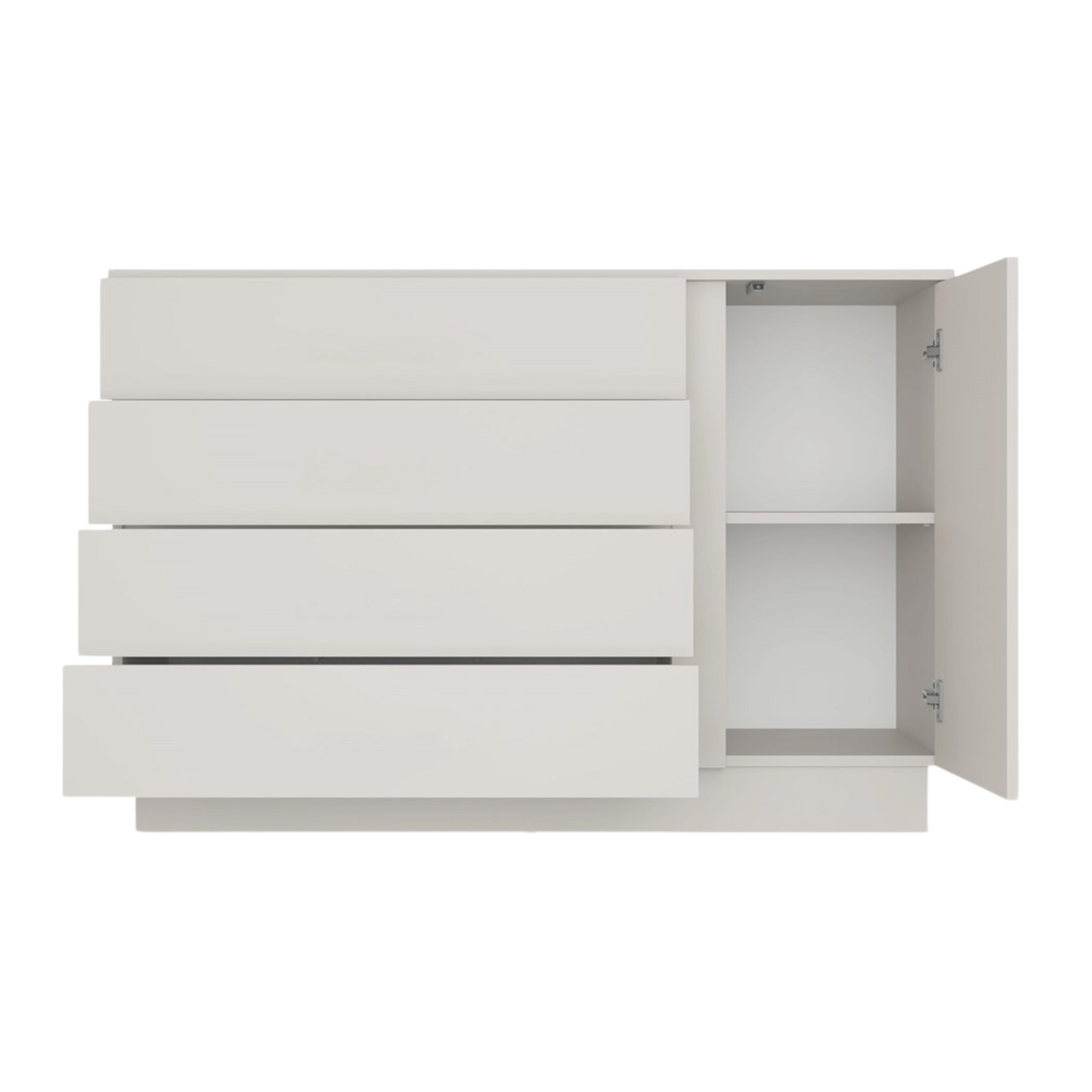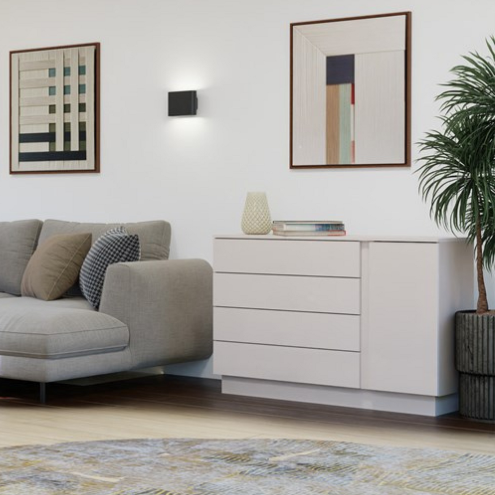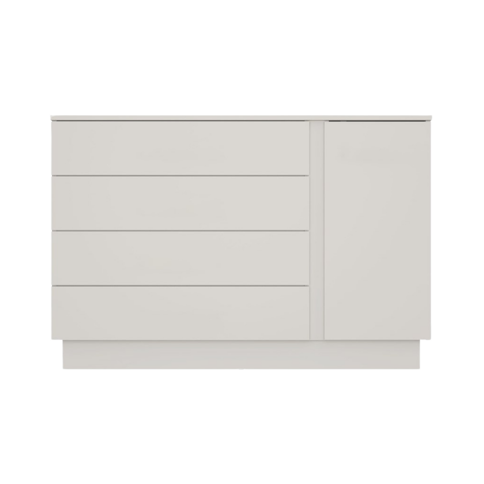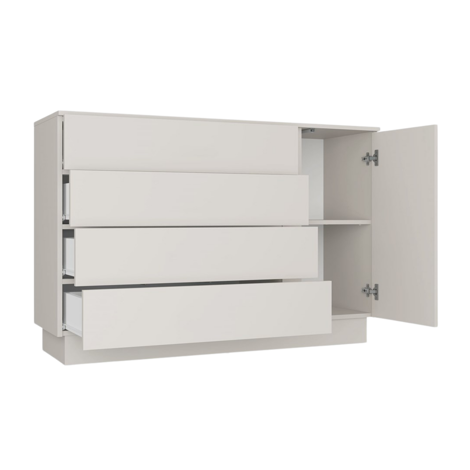 Komoda ZAMBER wyposażona została w jednodrzwiową szafkę oraz aż cztery szuflady. To idealna propozycja dla osób, które cenią nowoczesny design i prostotę. Zaprojektowana z myślą o maksymalnej funkcjonalności, oferuje przestronną przestrzeń do przechowywania, jednocześnie stanowiąc stylową ozdobę wnętrza. Uniwersalna komoda z delikatnym nowoczesnym wyglądem świetnie komponuje się zarówno w nowoczesnych, jak i bardziej klasycznych aranżacjach.