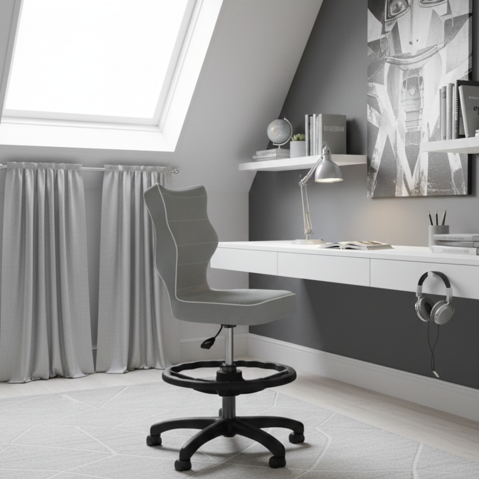 Krzesło LUMI z podnóżkiem to funkcjonalny i wygodny model zaprojektowany z myślą o dzieciach oraz młodzieży. Idealnie dopasowuje się do biurek o wysokości 70–82 cm, zapewniając komfort zarówno podczas nauki, jak i codziennego użytkowania przy komputerze. Tapicerowane siedzisko w uniwersalnym szarym kolorze doskonale sprawdzi się w nowoczesnych wnętrzach.