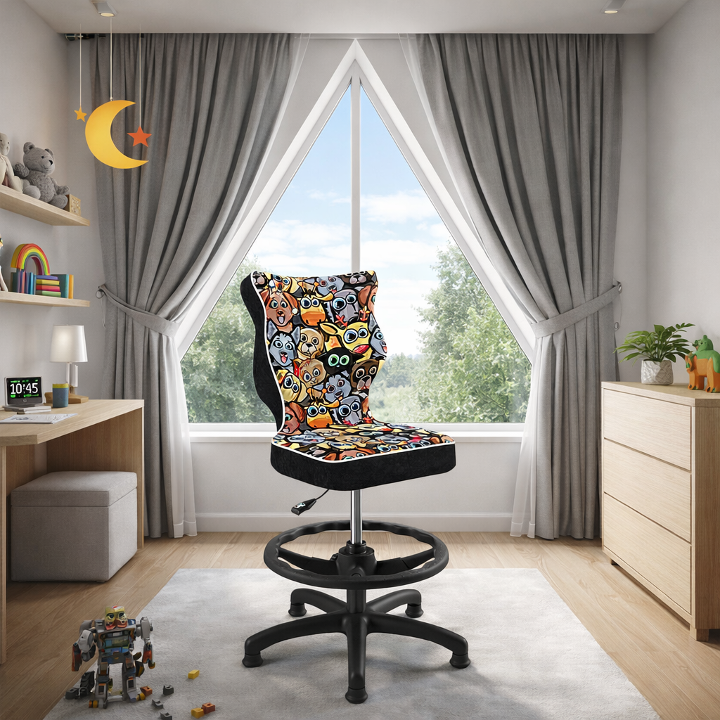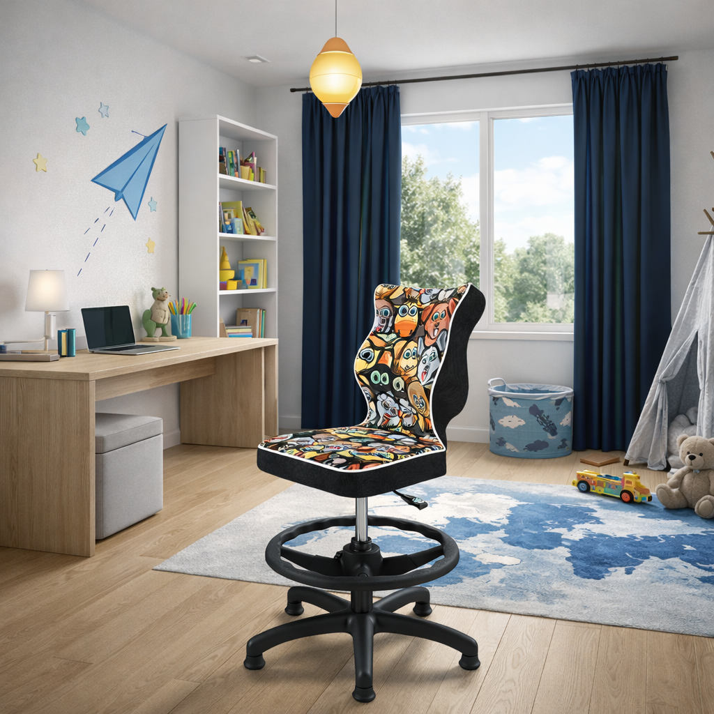 Krzesło LUMI z podnóżkiem to funkcjonalny i estetyczny model stworzony z myślą o dzieciach i młodzieży. Doskonale współgra z biurkami o wysokości 70–82 cm, zapewniając prawidłową pozycję siedzącą podczas nauki, odrabiania lekcji czy korzystania z komputera. Tapicerowane czarne krzesło zostało w całości zaprojektowane i wyprodukowane w Polsce, z naciskiem na jakość, bezpieczeństwo i komfort codziennego użytkowania.