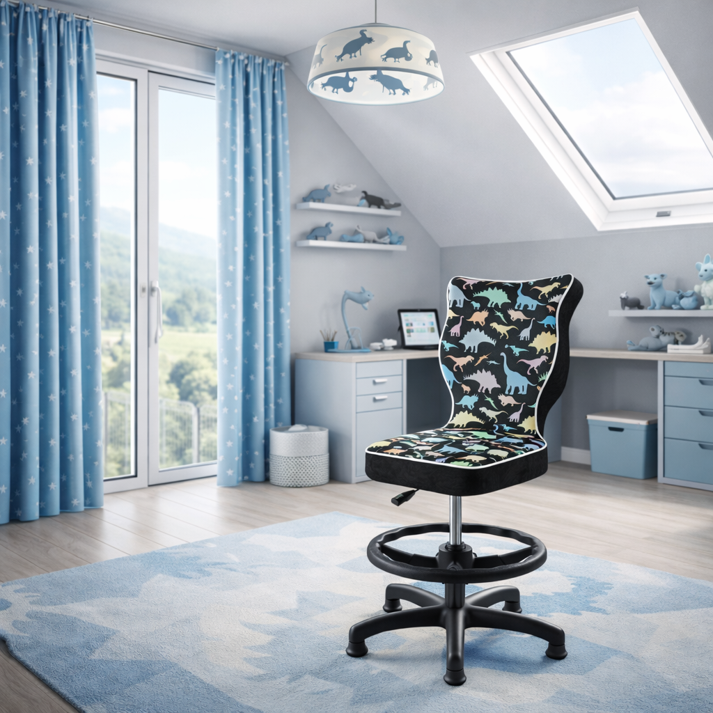 Krzesło LUMI z podnóżkiem to ergonomiczny model zaprojektowany z myślą o dzieciach i młodzieży korzystających z biurek o wysokości od 70 do 82 cm. Tapicerowane siedzisko z tkaniny Storia w motywie dinozaurów łączy wygodę z atrakcyjnym wyglądem. To idealne rozwiązanie do codziennej nauki, rysowania oraz czasu spędzanego przy komputerze.