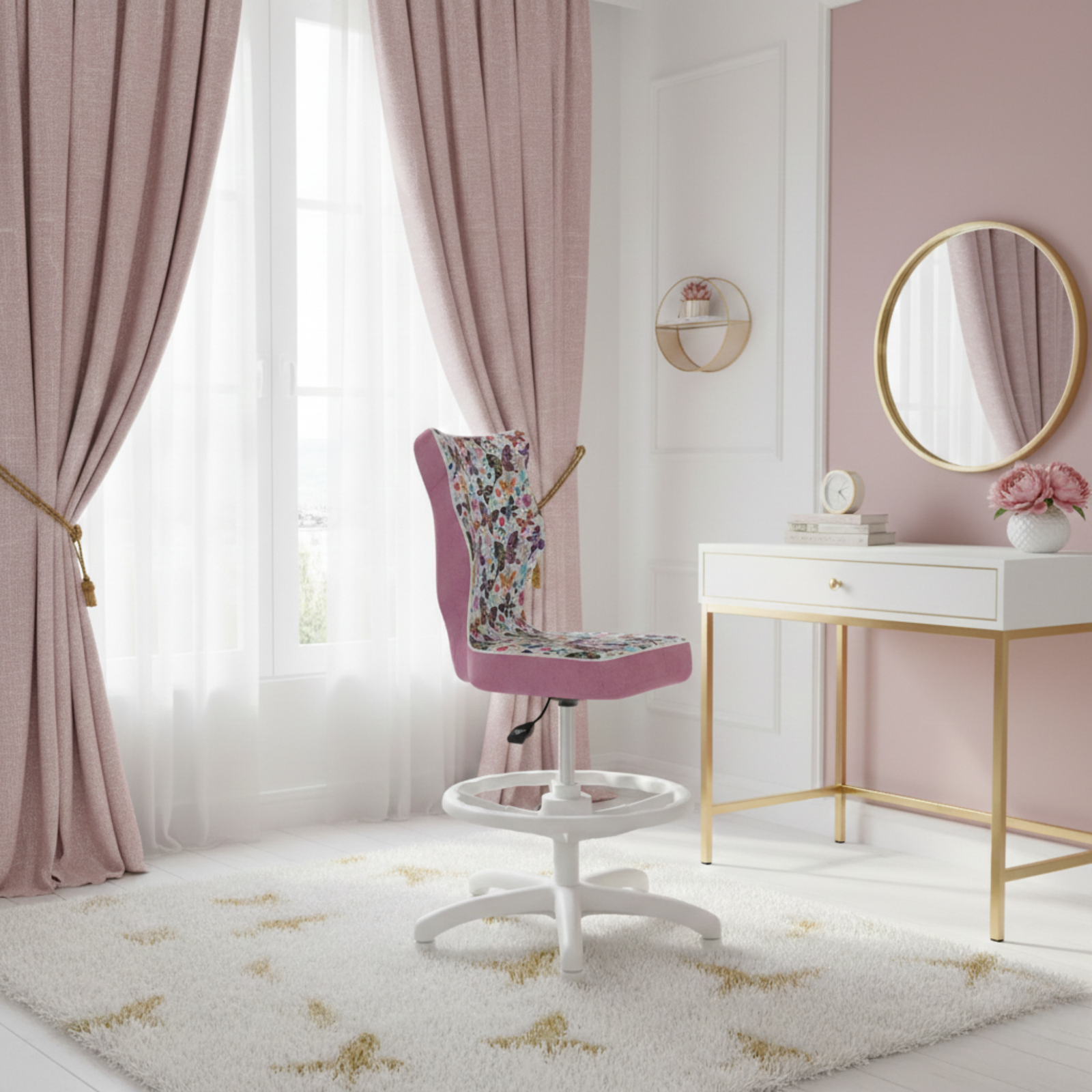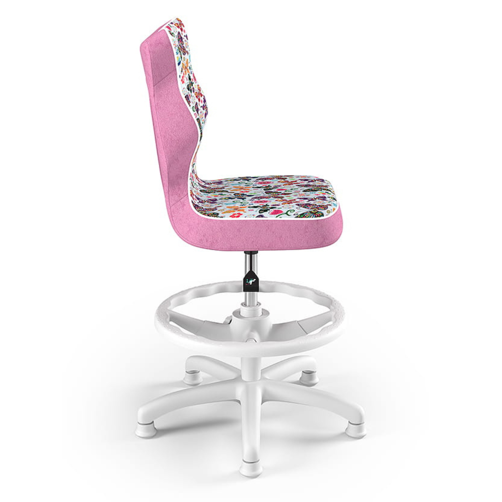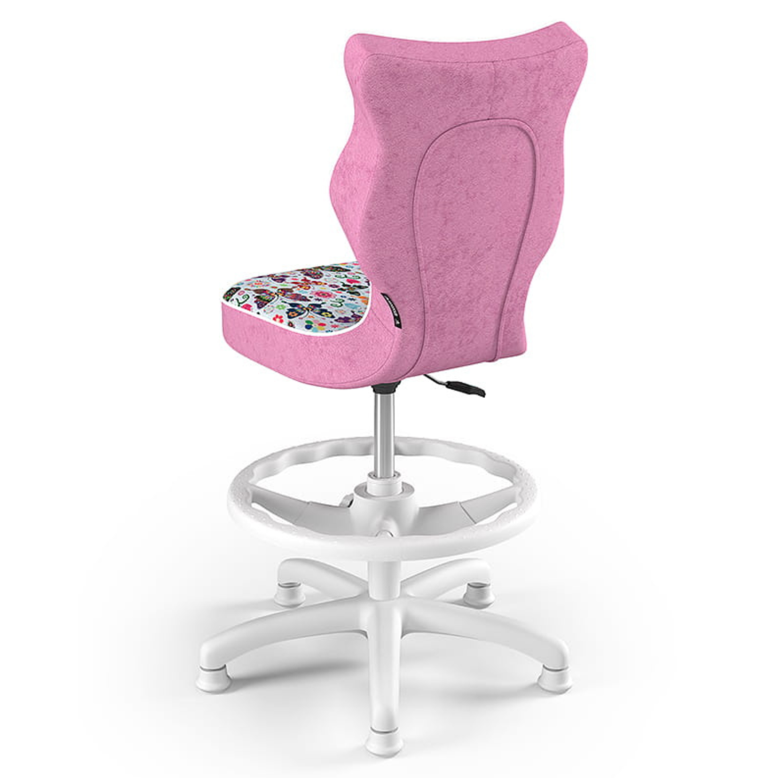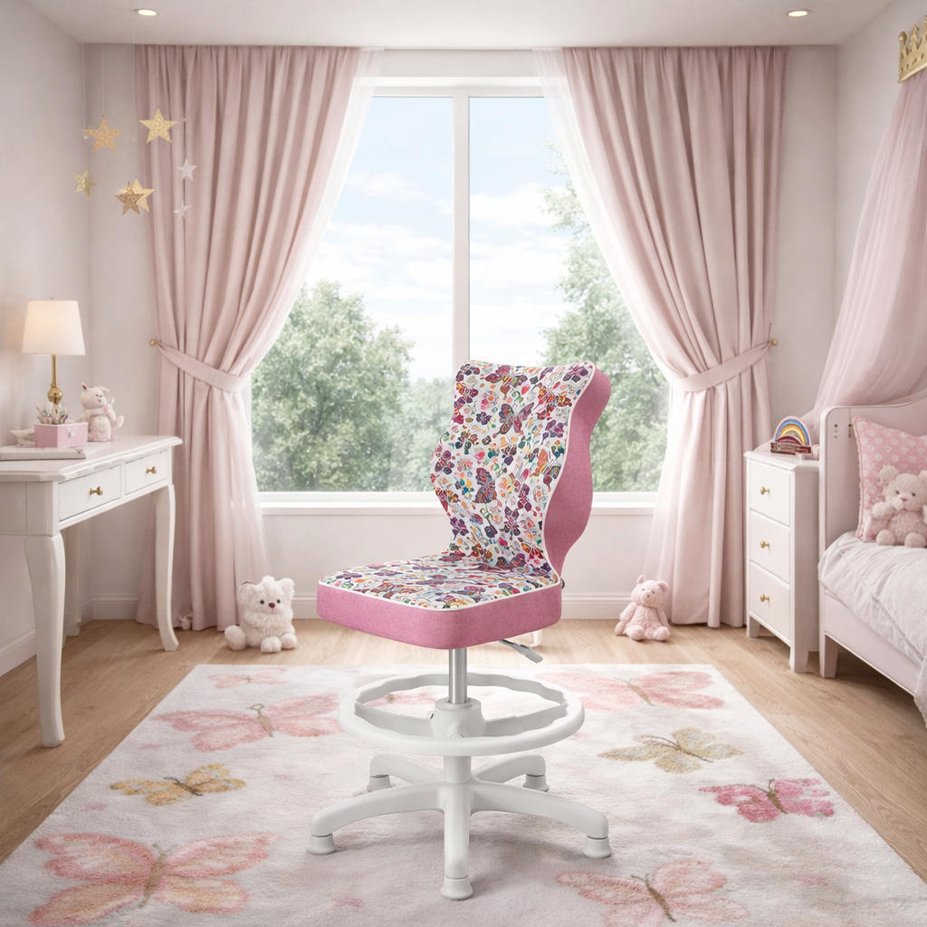 Krzesło LUMI z podnóżkiem to nowoczesne rozwiązanie stworzone z myślą o dzieciach korzystających z biurek o wysokości od 70 do 82 cm. Model ten łączy funkcjonalność z atrakcyjnym wyglądem, oferując ergonomiczny kształt, który wspiera prawidłową postawę ciała. Biała podstawa oraz tapicerka z motywem motylków nadają mu lekkości i dziecięcego charakteru, idealnie wpisując się w przestrzeń pokoju młodego użytkownika.