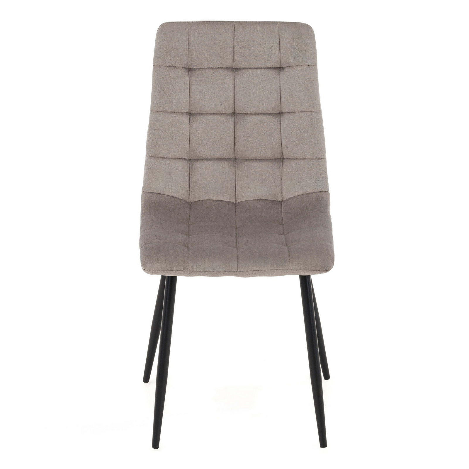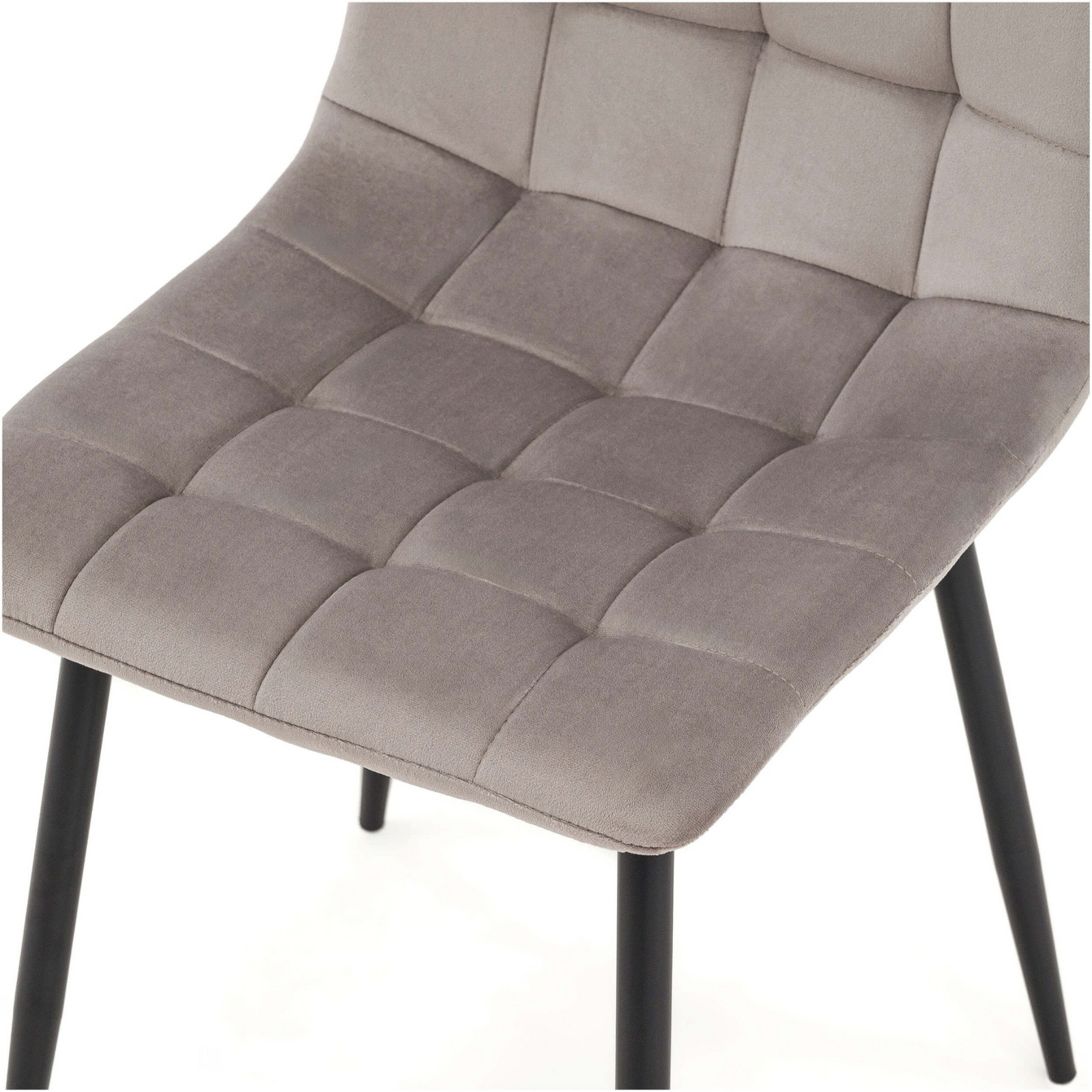 Profilowane oparcie i siedzisko, miękkie wypełnienie i przyjemna w dotyku tapicerka, gwarantują wygodę zarówno podczas codziennych posiłków, jak i dłuższych posiedzeń przy stole. Delikatna w dotyku tkanina welur zapewnia wysoki komfort i dodaje eleganckiego, ponadczasowego charakteru. Geometryczne przeszycia w postaci kwadratowego pikowania nadają nowoczesnego charakteru o subtelnie dekoracyjnym wyglądzie. Brak podłokietników nadaje konstrukcji lekkości i ułatwia wsuwanie krzesła pod stół, co sprawdza się zwłaszcza w mniejszych przestrzeniach. Cztery smukłe wysokie nóżki wykonane z metalu malowanego proszkowo na czarno są trwałe i odporne na zarysowania, a przy tym zapewniają stabilność.