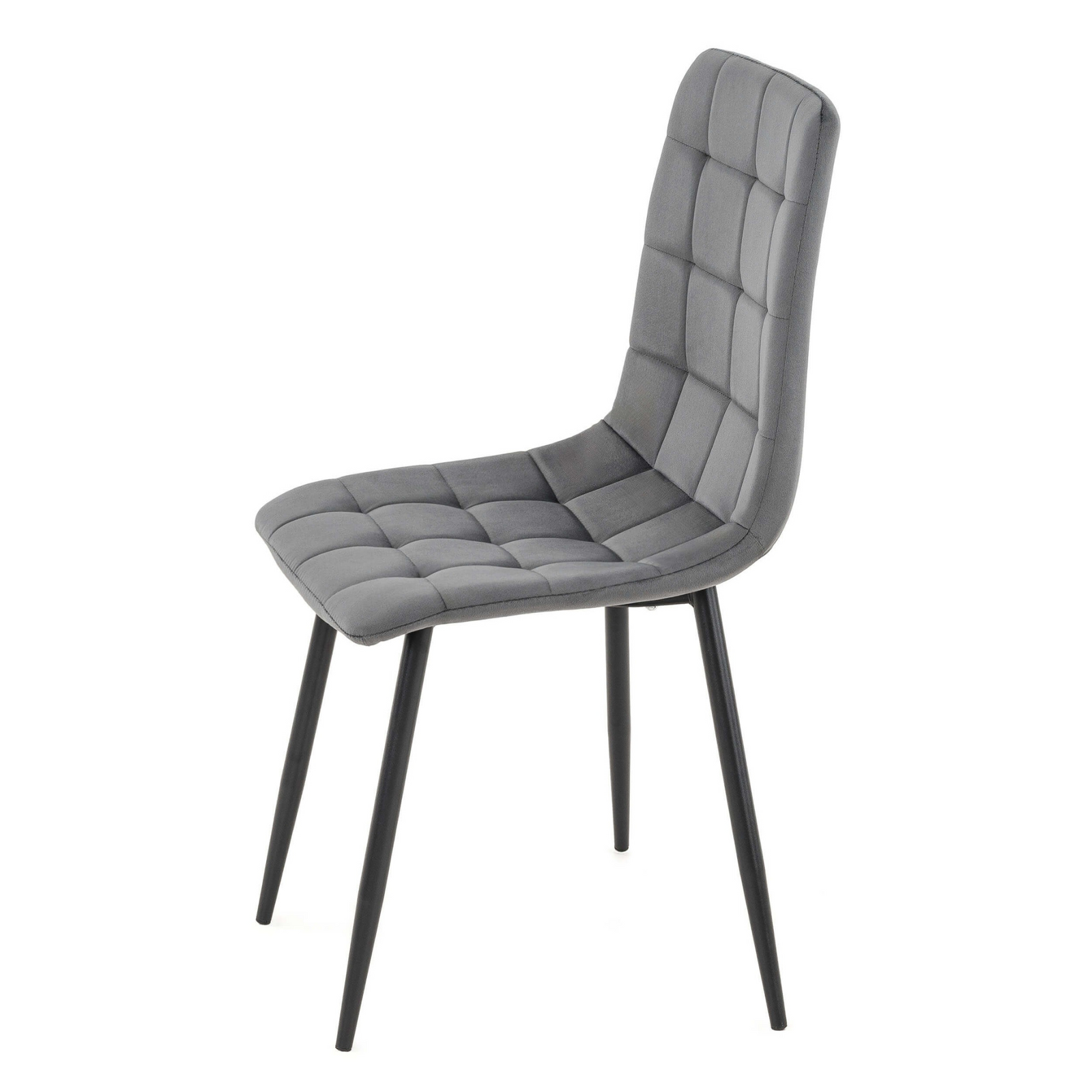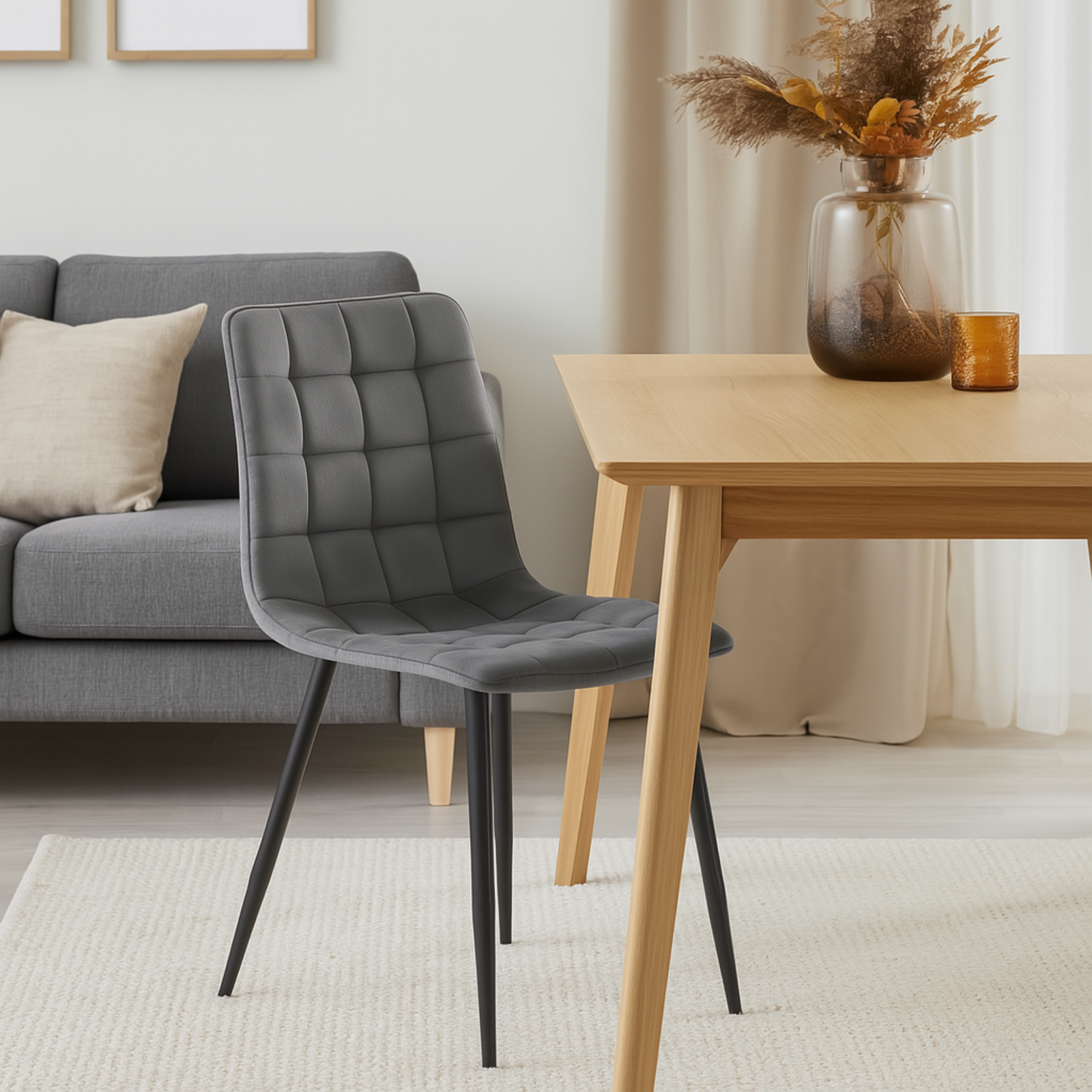 Profilowane oparcie i siedzisko, miękkie wypełnienie i przyjemna w dotyku tapicerka, gwarantują wygodę zarówno podczas codziennych posiłków, jak i dłuższych posiedzeń przy stole. Delikatna w dotyku tkanina welur zapewnia wysoki komfort i dodaje eleganckiego, ponadczasowego charakteru. Geometryczne przeszycia w postaci kwadratowego pikowania nadają nowoczesnego charakteru o subtelnie dekoracyjnym wyglądzie. Brak podłokietników nadaje konstrukcji lekkości i ułatwia wsuwanie krzesła pod stół, co sprawdza się zwłaszcza w mniejszych przestrzeniach. Cztery smukłe wysokie nóżki wykonane z metalu malowanego proszkowo na czarno są trwałe i odporne na zarysowania, a przy tym zapewniają stabilność.