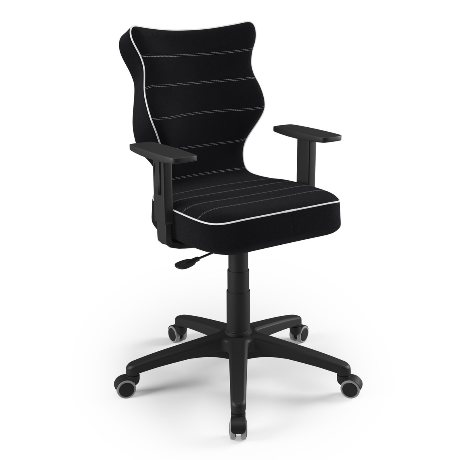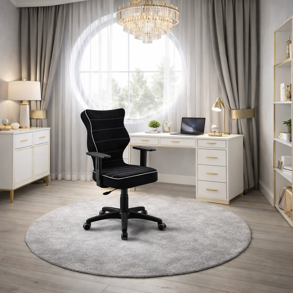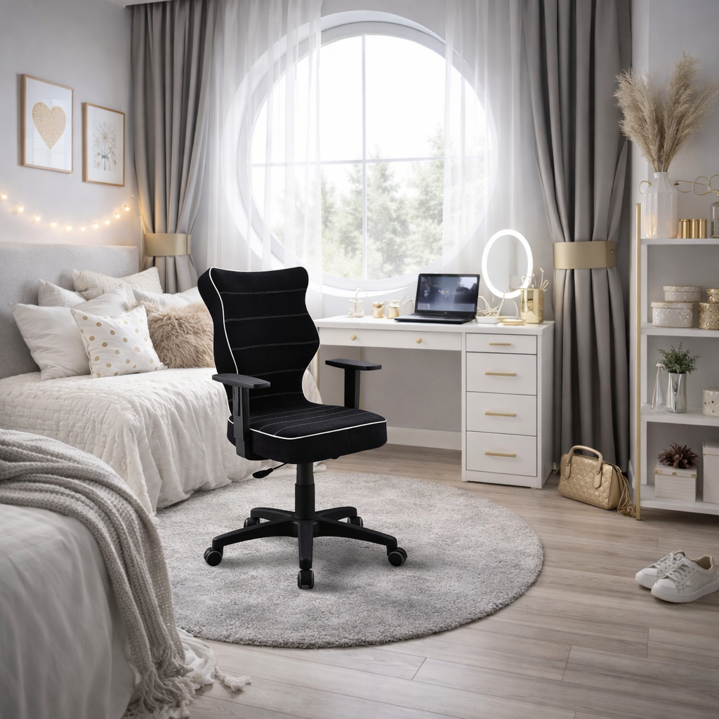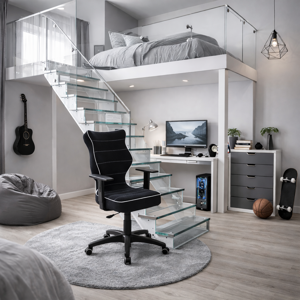 Krzesło AXIS to ergonomiczny model zaprojektowany z myślą o biurkach o wysokości od 70 do 82 cm. Czarna kolorystyka oraz nowoczesna forma sprawiają, że doskonale wpisuje się w przestrzeń pokoju ucznia, nastolatka lub domowego biura. Produkt został zaprojektowany i wyprodukowany w Polsce, z wykorzystaniem bezpiecznych materiałów oraz sprawdzonych rozwiązań konstrukcyjnych.