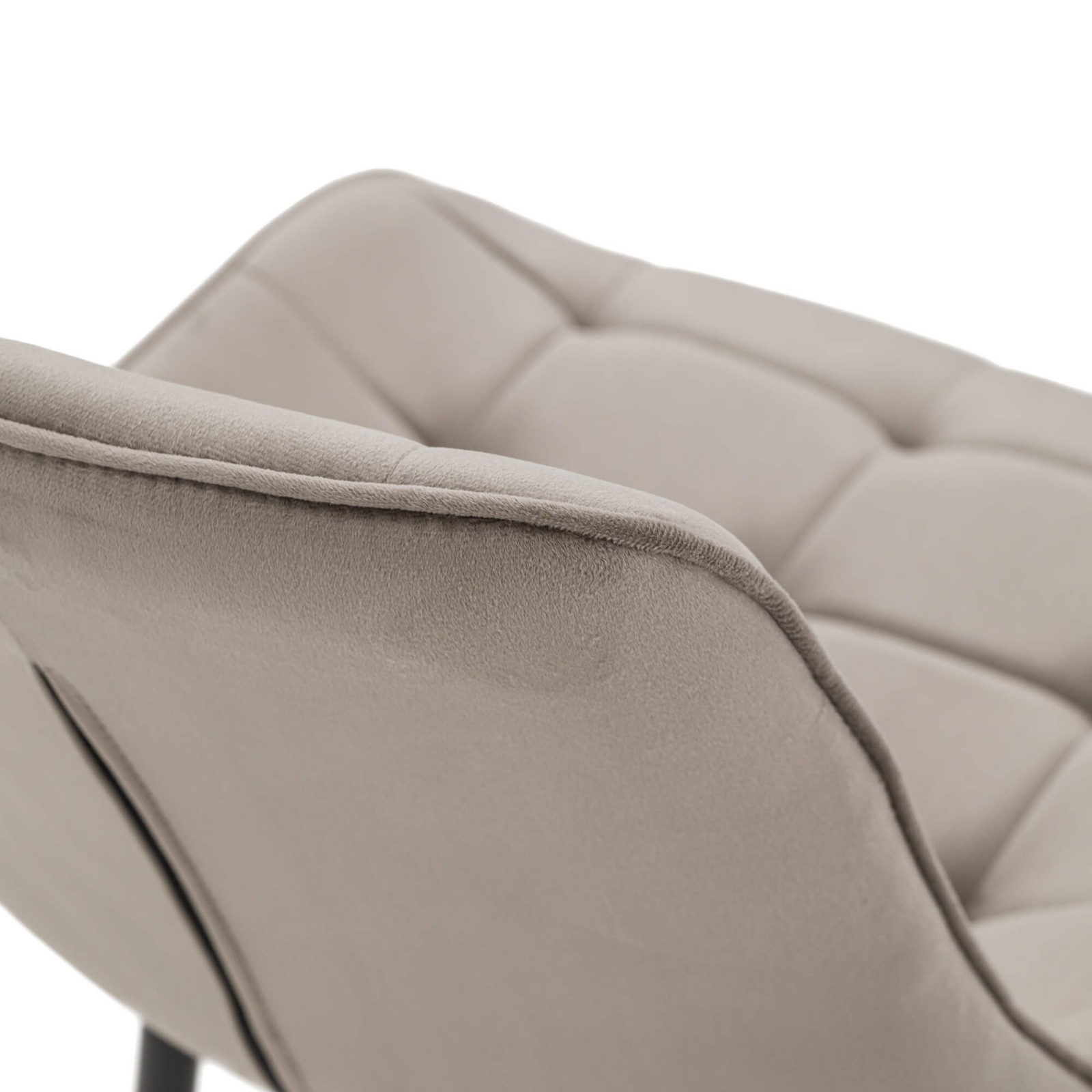 Krzesło tapicerowane delikatną w dotyku tkaniną welur na wysokich, smukłych czarnych metalowych nogach łączy elegancję z nutą loftowego charakteru. Charakterystyczne pikowania podkreślają elegancki styl i podnoszą walory estetyczne, uatrakcyjniając wygląd tego minimalistycznego mebla. Uniwersalny design sprawia, że krzesło doskonale sprawdzi się w przestrzeni domowej - od kuchni, jadalni, poprzez salon, jak również w przestrzeniach komercyjnych - biurze, sali konferencyjnej czy poczekalni, gdzie połączenie stylu i komfortu jest kluczowe.