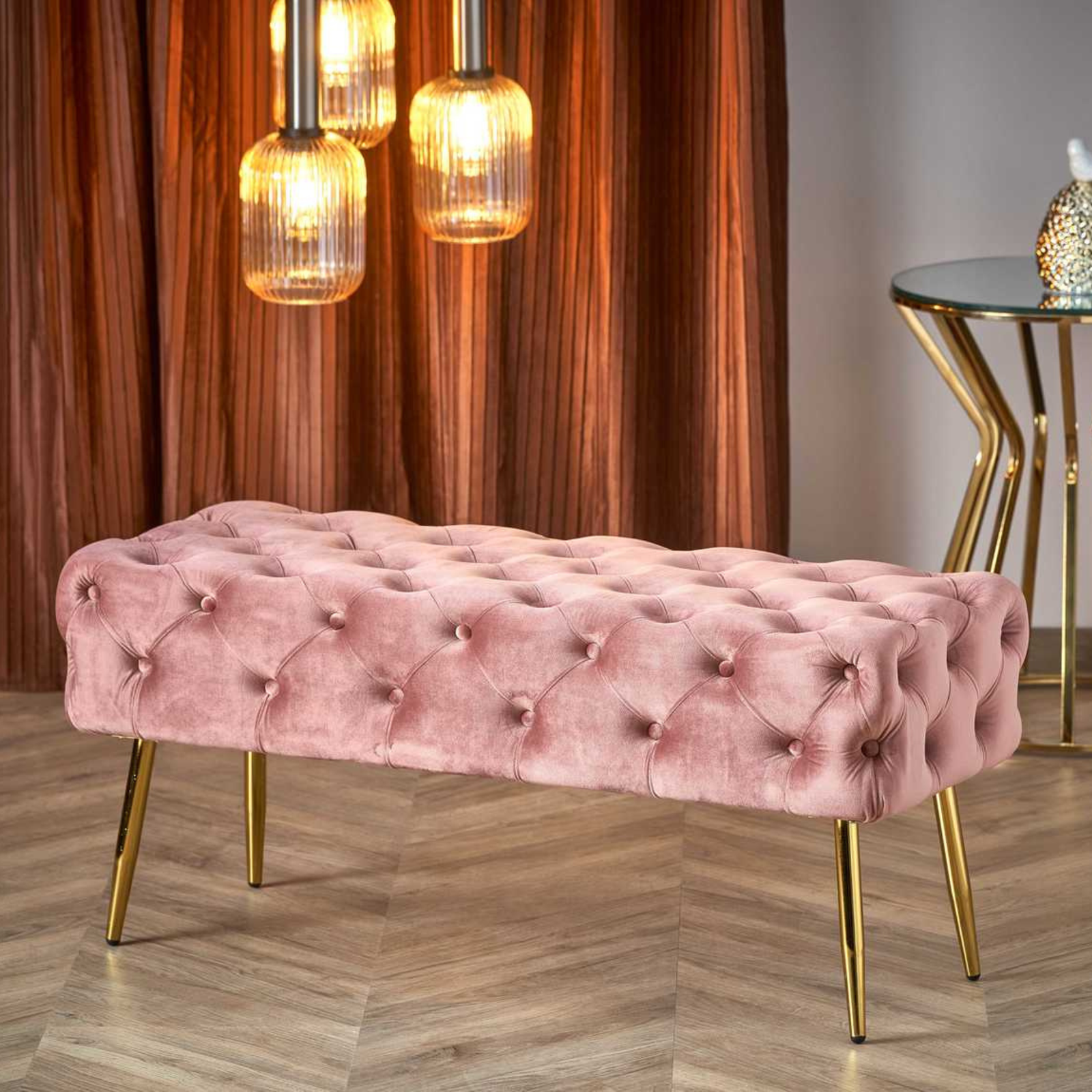 Model AURORA zachwyca pikowanym siedziskiem tapicerowanym miękką, aksamitną tkaniną velvet. Materiał ten jest niezwykle przyjemny w dotyku, a jego delikatny połysk pięknie współgra z eleganckim kolorem różowym. Całość dopełniają smukłe, złote nogi wykonane z metalu, które dodają lekkości i wytworności. Ławka doskonale wpisuje się w styl glamour, ale równie dobrze odnajdzie się we wnętrzach nowoczesnych i klasycznych.