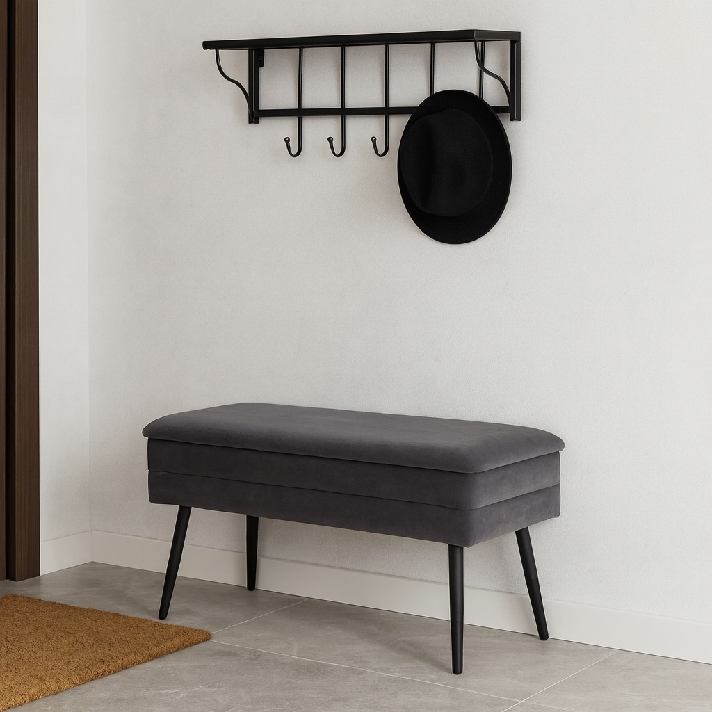Ławka LILA to połączenie wyjątkowego designu i praktycznych rozwiązań. Jej subtelny szary kolor i czarne wykończenie sprawiają, że idealnie wpasuje się w eleganckie wnętrza utrzymane w stylu glamour. Miękkie siedzisko pokryte tkaniną velvet nadaje wnętrzu ciepła i przytulności, a wbudowany schowek zapewnia dodatkowe miejsce do przechowywania drobiazgów. To mebel, który łączy piękno, wygodę i funkcjonalność w jednym.