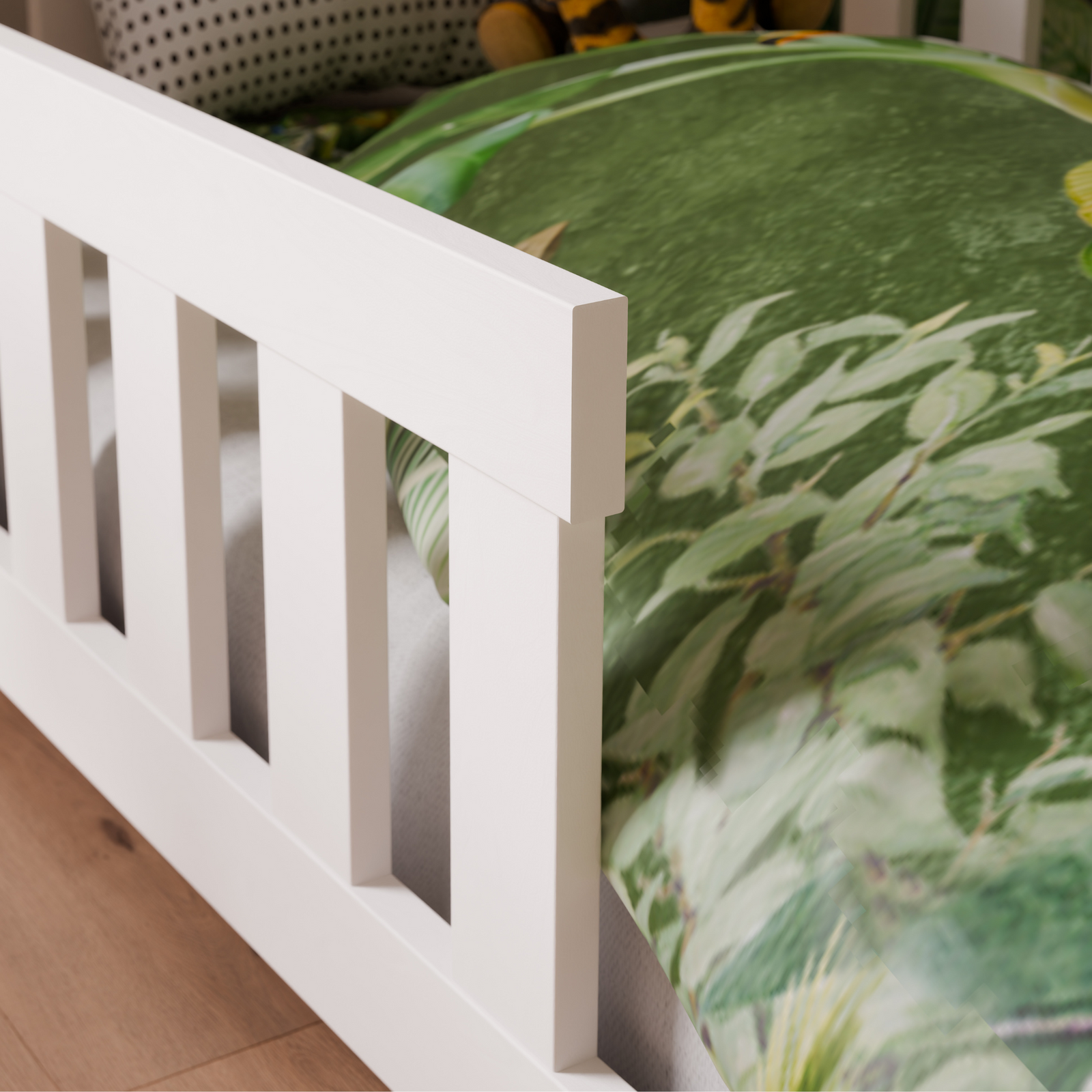 Łóżko domek DUBI zostało stworzone z myślą o bezpieczeństwie i komforcie dziecka na co dzień. Jego przemyślana konstrukcja, w kształcie przytulnego domku, z odpowiednio wysokimi bokami i barierką, zapewnia łatwy dostęp oraz komfortowy wypoczynek. To idealne miejsce, które daje dziecku poczucie prywatności, a jednocześnie jest bezpiecznym kącikiem do zabawy.