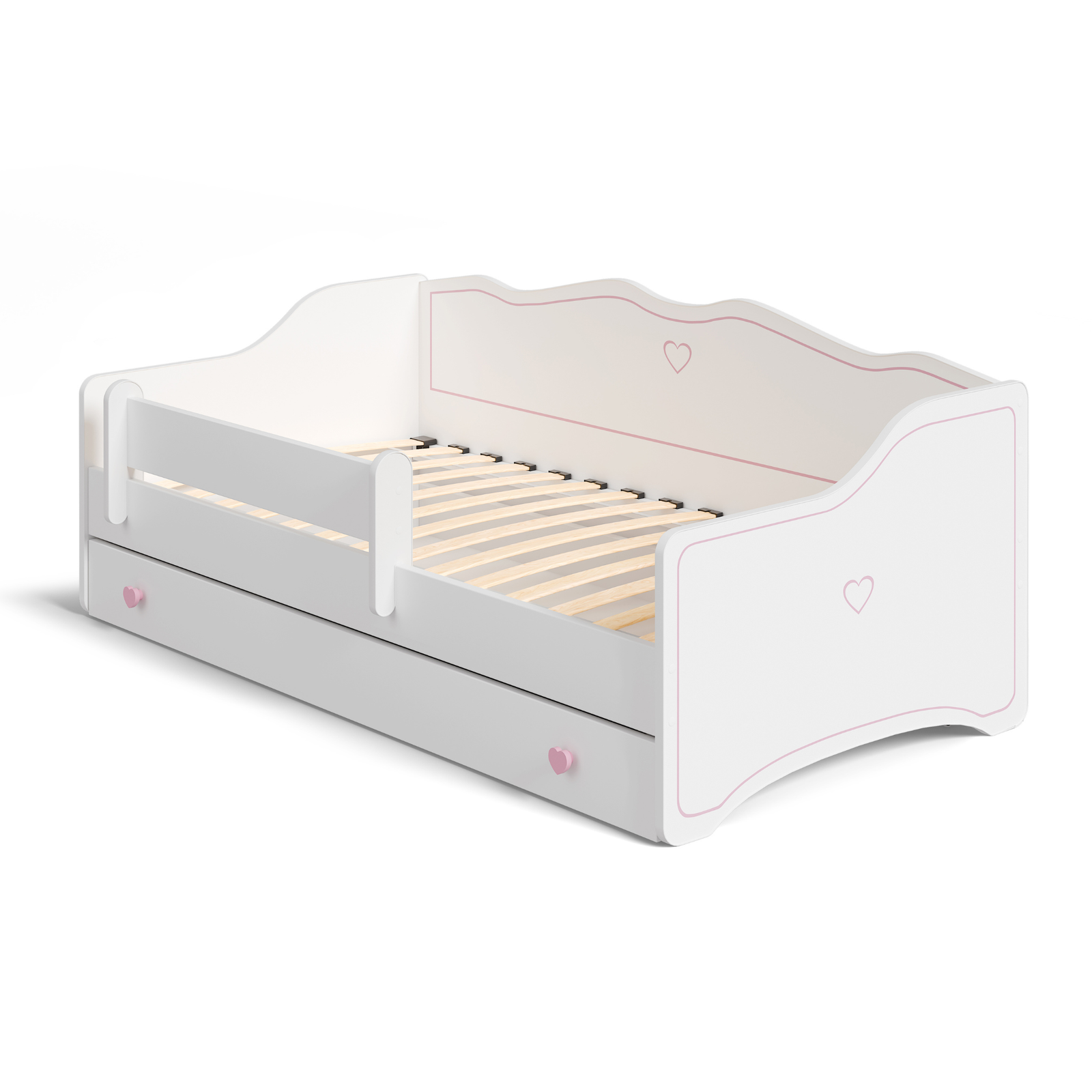 Łóżko dziecięce EMMA 160x80 barierka szuflada uchwyty serduszka - Biały / Różowy
