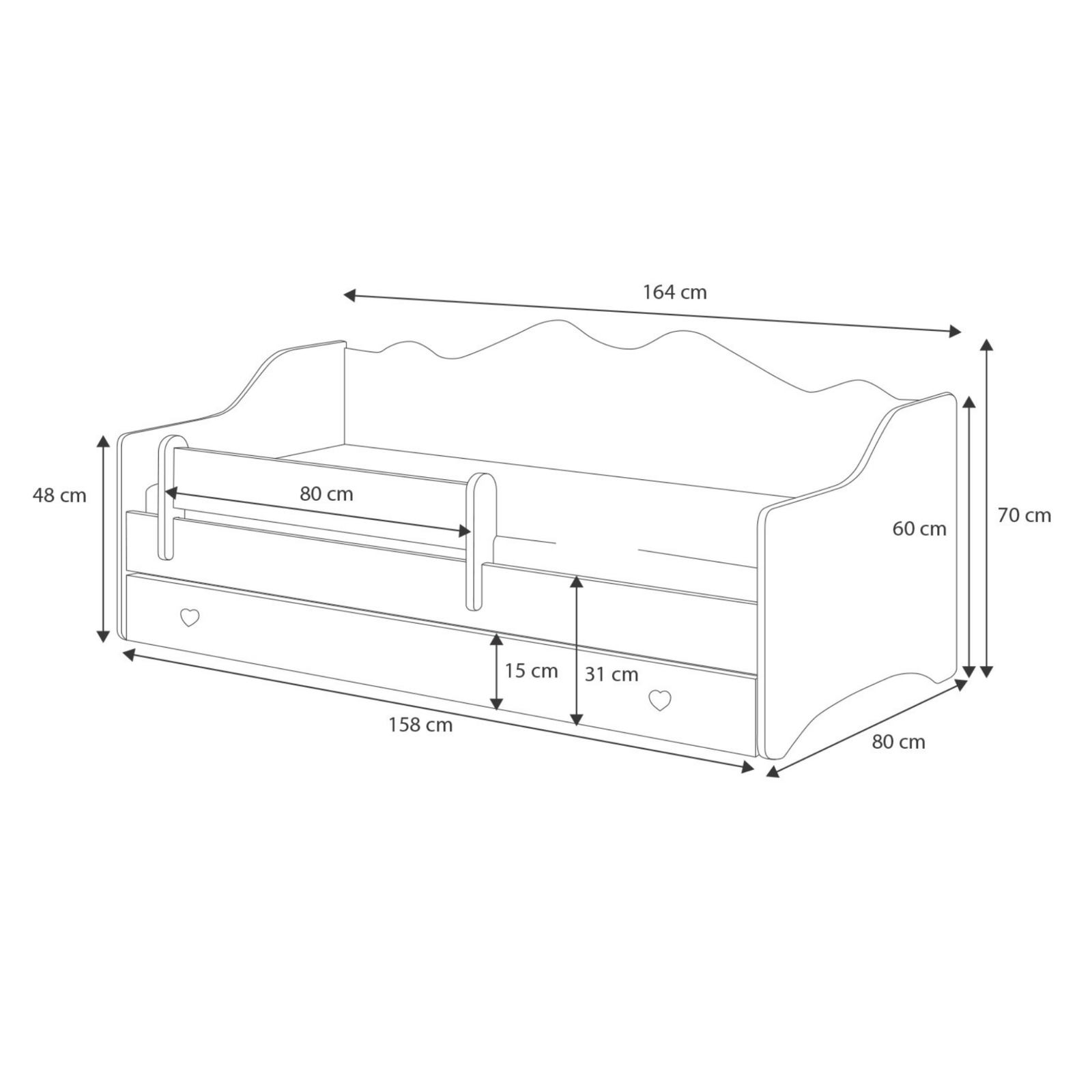 • • Łóżko: 164 cm x 85 cm x 70 cm