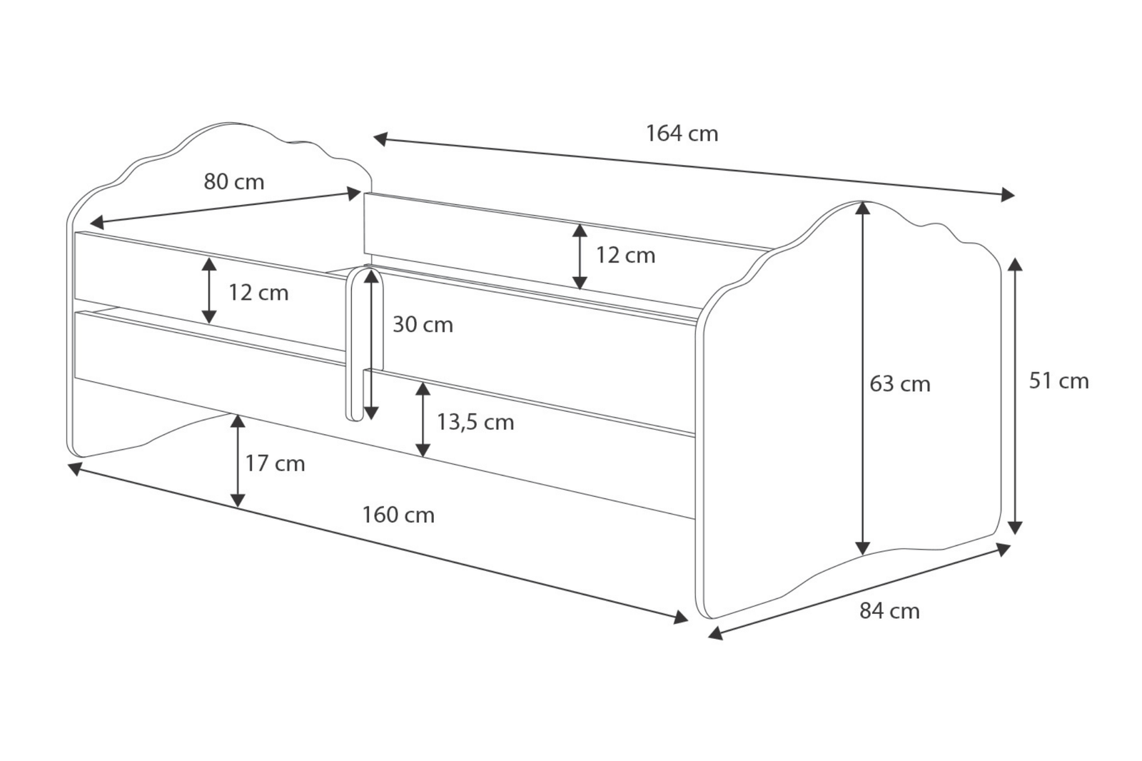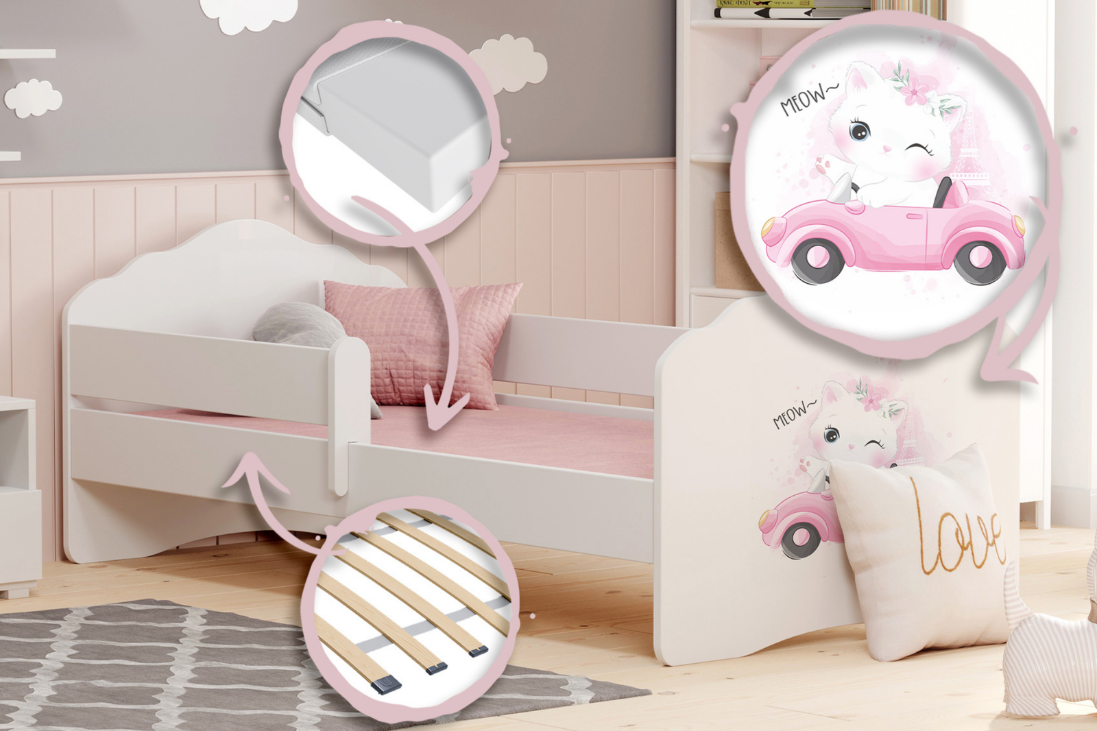 Łóżko dziecięce FALA to mebel oferujący wygodę, bezpieczeństwo i funkcjonalność. Dzięki uniwersalnemu designowi, łóżko łatwo wpasowuje się w różne style aranżacyjne. Ten model łóżka dostępny jest w dwóch praktycznych wymiarach – 140x70 cm i 160x80 cm – aby jak najlepiej dopasować go do potrzeb rosnącego dziecka oraz dostępnej przestrzeni w pokoju. Łóżko białe z grafiką zapewnia dziecku bezpieczne miejsce do spania i zabawy, szybko stając się ulubionym meblem w pokoju.