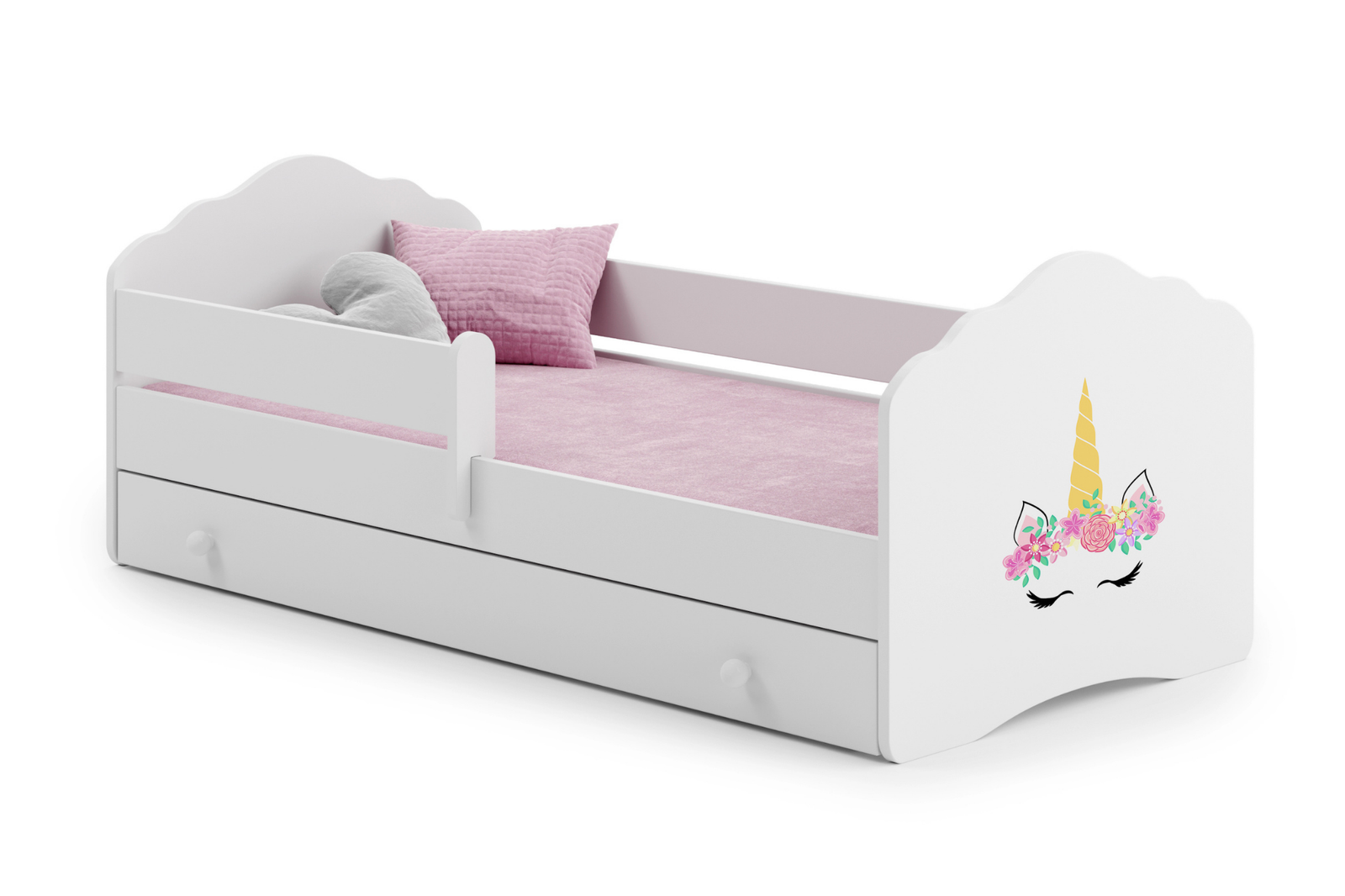 ŁÓŻKO DZIECIĘCE FALA Z BARIERKĄ SZUFLADĄ I GRAFIKĄ