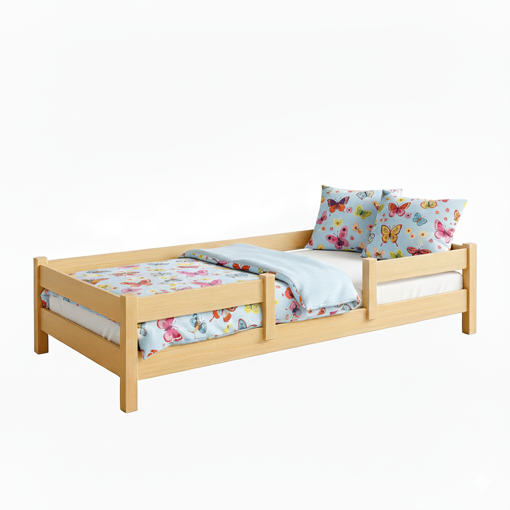 Łóżko LOFTO w rozmiarze 120×60 cm to naturalne, bezpieczne i minimalistyczne rozwiązanie stworzone z myślą o komforcie i zdrowym śnie najmłodszych. W całości powstaje z litego, klejonego drewna sosnowego klasy I, które jest wolne od lakierów i substancji chemicznych, dzięki czemu zapewnia wyjątkowo przyjazne środowisko. Jego solidna konstrukcja oraz starannie dopracowane detale sprawiają, że model doskonale odnajduje się w stylistyce Montessori oraz w nowoczesnych pokojach dziecięcych.