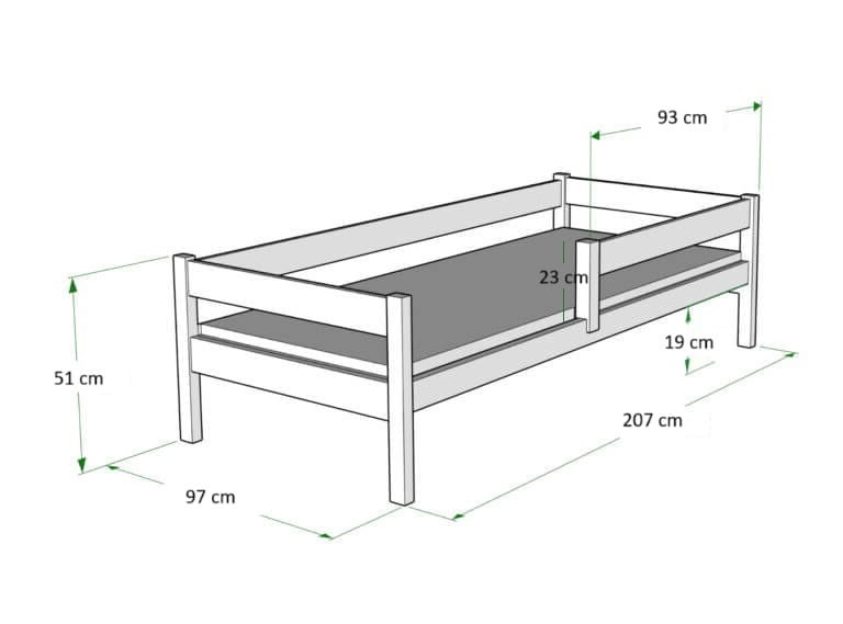 Wymiary materaca: 90x200 cm. Nóżki o wysokości 19 cm, barierki mają 23 cm.