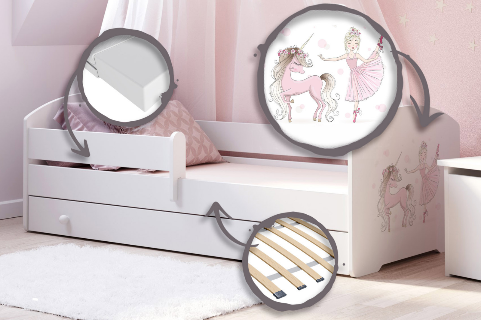 Łóżko dziecięce LUK 160x80 barierka szuflada grafika - Dziewczynka z jednorożcem