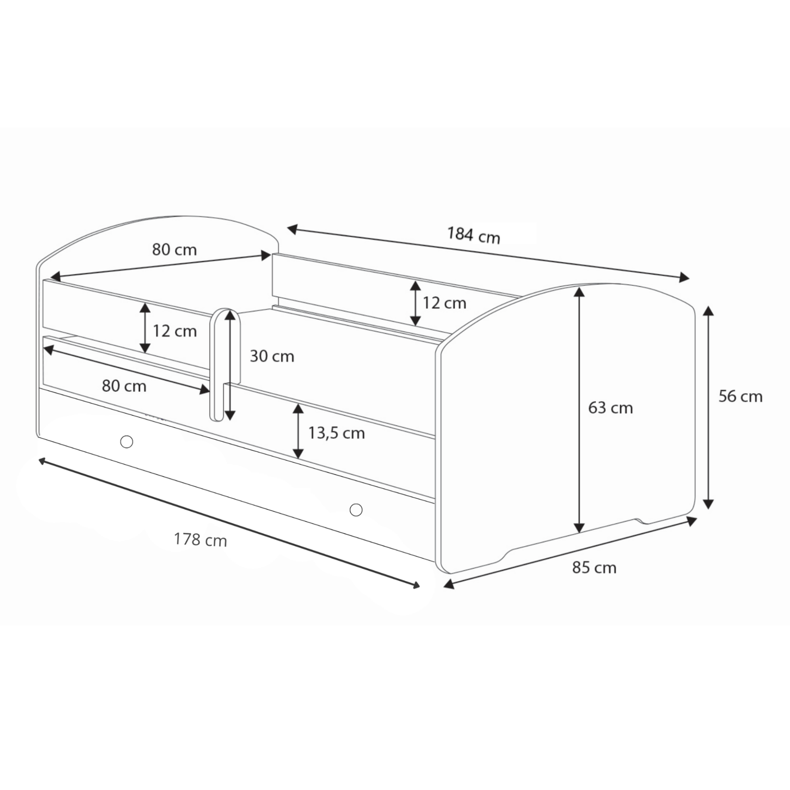 • • Łóżko górne: 184 cm x 85 cm x 63 cm
