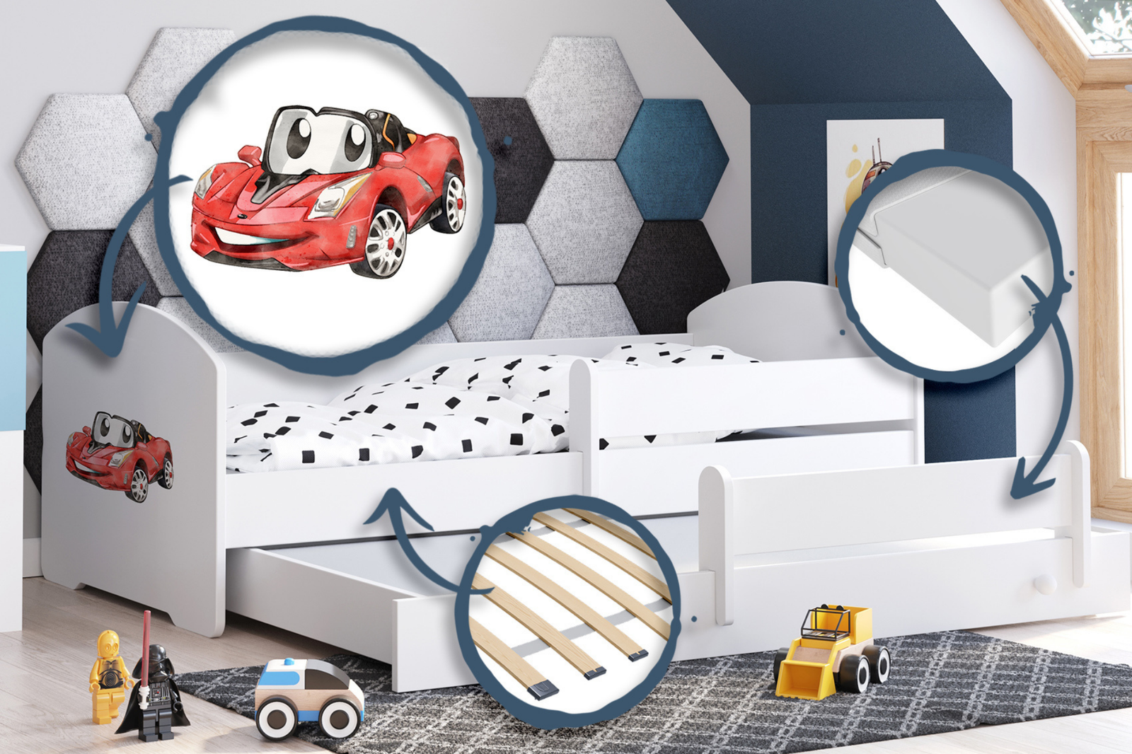 Łóżko LUK II to praktyczne i stylowe rozwiązanie z dodatkowym miejscem do spania, zapewniające wygodę, bezpieczeństwo i funkcjonalność w dziecięcym pokoju. Możliwość wysunięcia dolnego poziomu, zamienia pojedyncze łóżko w podwójne, dzięki czemu pozwala maksymalnie wykorzystać przestrzeń w pokoju, co jest niezwykle praktyczne w przypadku rodzeństwa lub niespodziewanych gości. Łóżko białe z grafiką zapewnia dziecku bezpieczne miejsce do spania i zabawy, szybko stając się ulubionym meblem w pokoju.