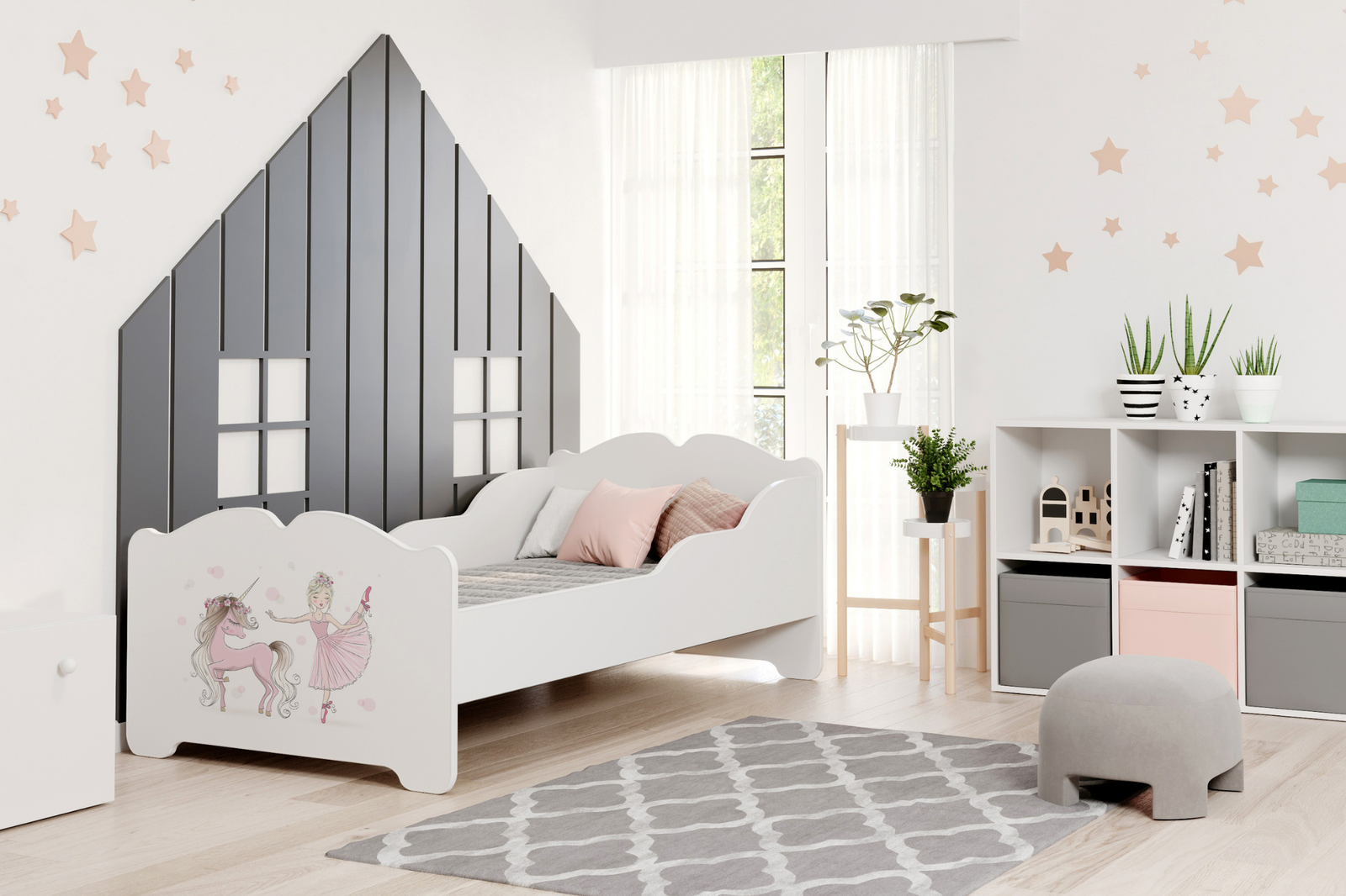 Łóżko dziecięce ANNA to mebel oferujący wygodę, bezpieczeństwo i funkcjonalność. Dzięki uniwersalnemu designowi, łóżko dziecięce wpasowuje się w różne style aranżacyjne. Model ten doskonale sprawdzi się w pokoju dziewczynki. Łóżko oferowane jest w dwóch praktycznych wymiarach – 160x80 cm i 140x70 cm – aby jak najlepiej dopasować go do potrzeb rosnącego dziecka oraz dostępnej przestrzeni w pokoju. Łóżko dziecięce białe z grafiką zapewnia dziecku bezpieczne miejsce do spania i zabawy, szybko stając się ulubionym meblem w pokoju.