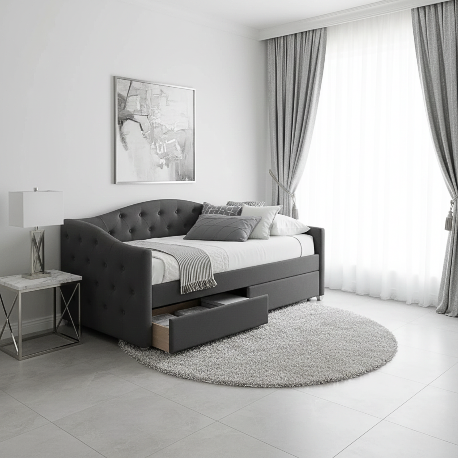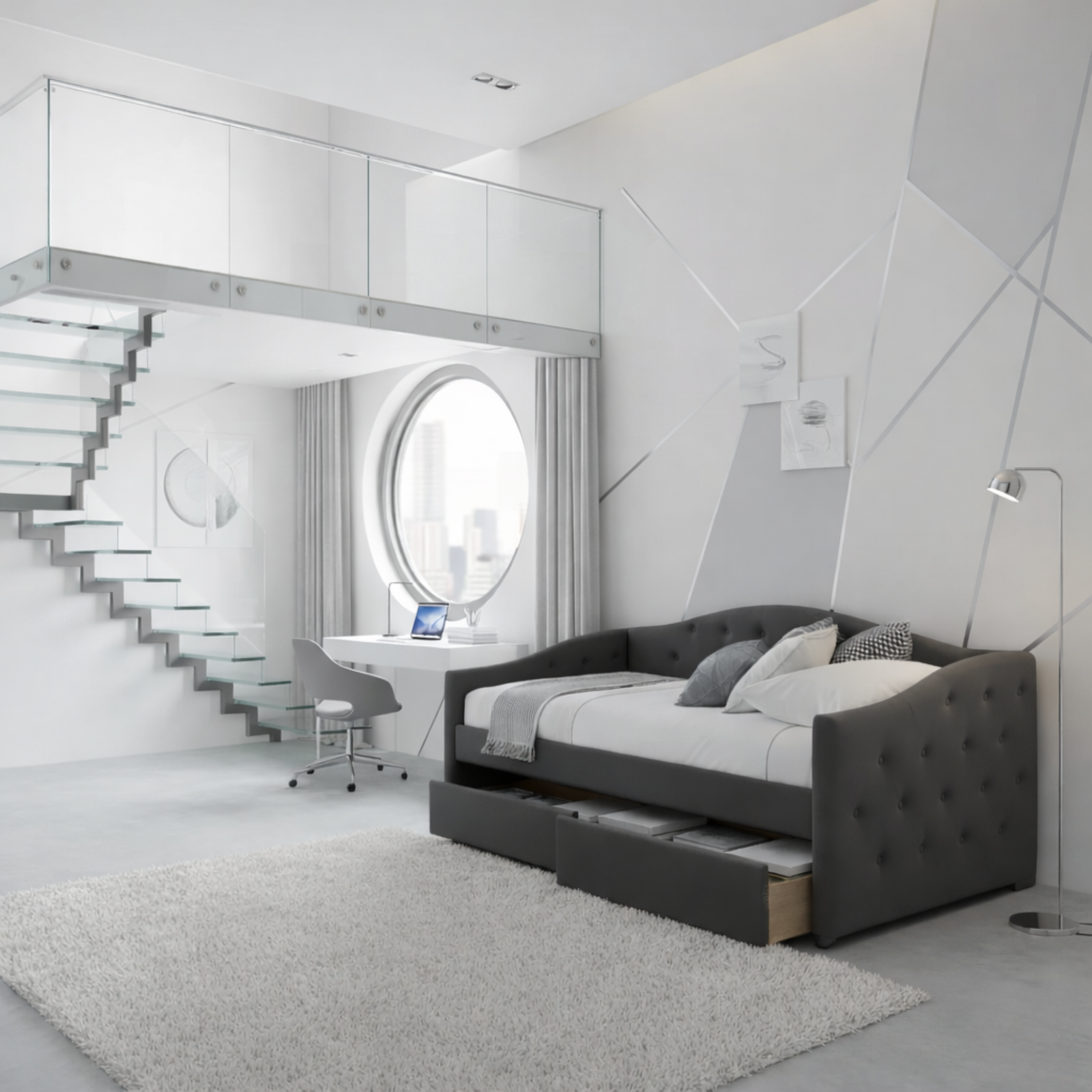 Łóżko LENORIA to połączenie klasycznej formy z nowoczesną funkcjonalnością. Tapicerowana konstrukcja wykończona miękką tkaniną velvet w eleganckim, popielatym odcieniu wprowadza do wnętrza przytulną atmosferę i subtelny styl. Model ten został zaprojektowany z myślą o codziennym komforcie snu oraz estetyce, która pasuje zarówno do sypialni, jak i pokoju młodzieżowego.