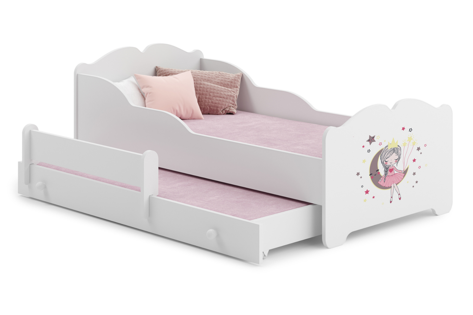 Łóżko ANNA II to funkcjonalne i stylowe rozwiązanie do pokoju dziecięcego, łączące wygodę, bezpieczeństwo i praktyczność. Dzięki wysuwanemu dolnemu poziomowi, pojedyncze łóżko w łatwy sposób zamienia się w podwójne, co pozwala optymalnie wykorzystać przestrzeń – idealne dla rodzeństwa lub gości. Nowoczesny, minimalistyczny design mebla sprawia, że łóżko z łatwością wkomponuje się w różne style aranżacyjne. Łóżko białe z grafiką zapewnia dziecku bezpieczne miejsce do spania i zabawy, szybko stając się ulubionym meblem w pokoju.