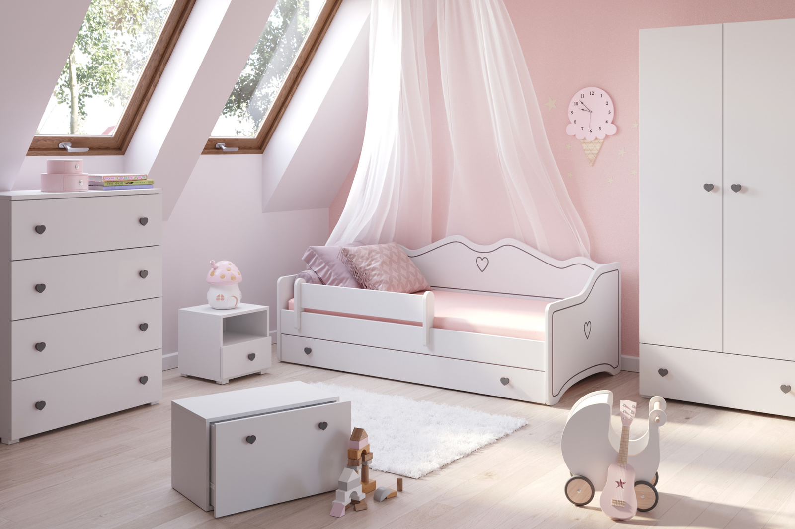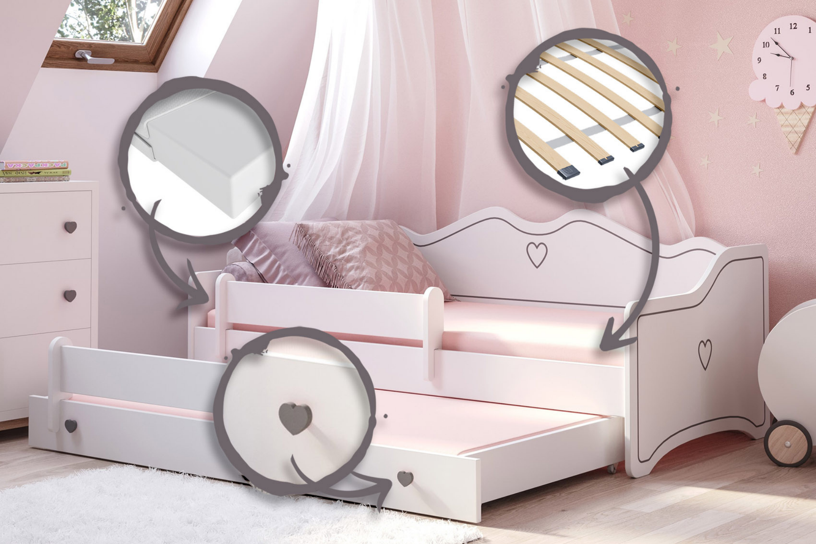 Łóżko dziecięce EMMA II to mebel oferujący wygodę, bezpieczeństwo i funkcjonalność. Ciekawy, a zarazem minimalistyczny design sprawia, że łóżko łatwo wpasowuje się w różne style aranżacyjne i uatrakcyjnia pokój dziewczynki. Urocze akcenty w postaci grafiki i uchwytów w serduszka dodają charakteru. Przy wyborze modelu EMMA II warto wziąć pod uwagę jego praktyczne użytkowanie. Zaletą łóżka jest jego kształt - zarówno tył jak i boki są odpowiednio wysokie, dzięki czemu w ciągu dnia łóżko może pełnić rolę sofy, na której można wygodnie usiąść i oprzeć plecy. Dzięki wysuwanemu dolnemu poziomowi, pojedyncze łóżko w łatwy sposób zamienia się w podwójne, co pozwala optymalnie wykorzystać przestrzeń – idealne dla rodzeństwa lub gości.