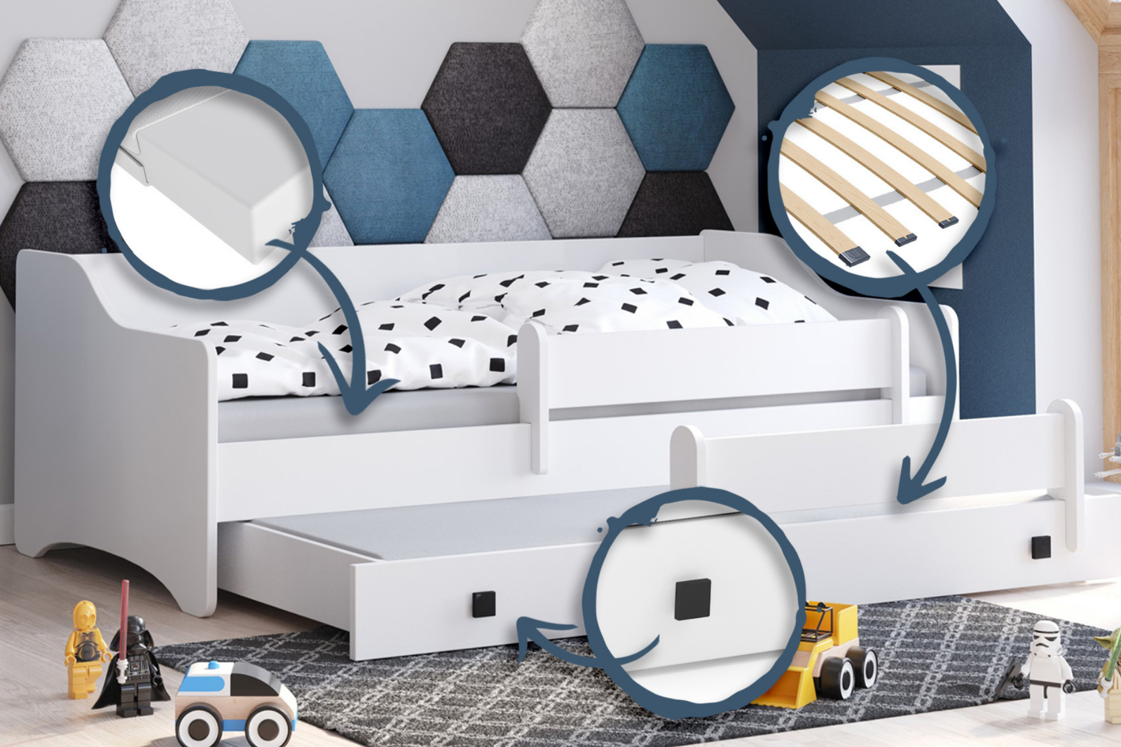 Łóżko ERYK II zostało zaprojektowane z myślą o estetyce, funkcjonalności i bezpieczeństwie. Konstrukcja powstała z wysokiej jakości płyty meblowej, co zapewnia stabilność. Delikatnie zaokrąglone krawędzie, zabezpieczone obrzeżem PCV eliminują ryzyko urazów. W zestawie znajdują się również dwie barierki zabezpieczające. Komfort wysuwania dolnej części łóżka zapewniają uchwyty w kształcie kwadratów, które dodatkowo zwiększają atrakcyjność mebla. Stelaż stworzony został z elastycznych listew brzozowych, sprężynujących w systemie FLEX, co przekłada się na jakość snu.