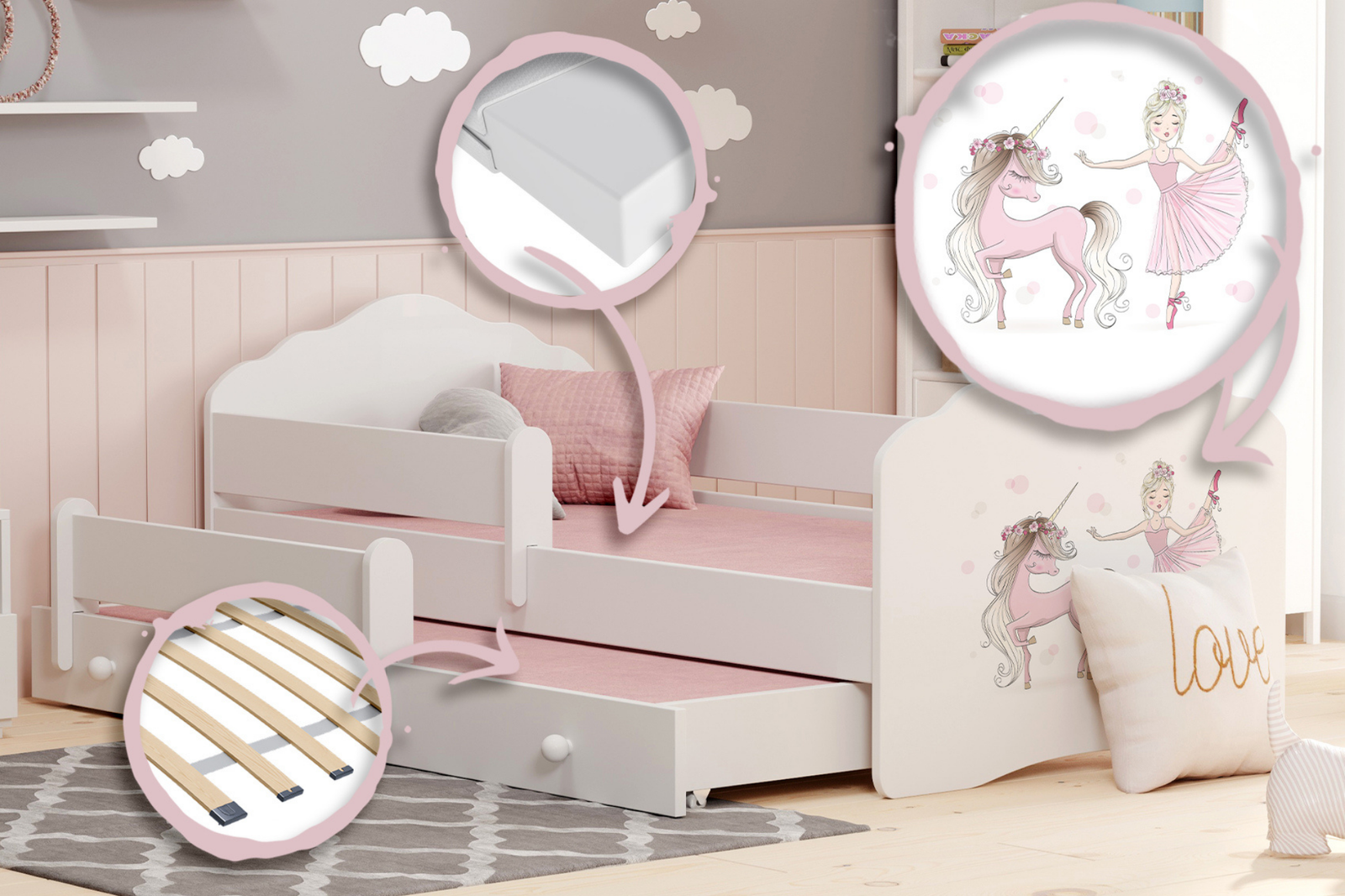 Łóżko FALA II to funkcjonalne i stylowe rozwiązanie do pokoju dziecięcego, łączące wygodę, bezpieczeństwo i praktyczność. Dzięki wysuwanemu dolnemu poziomowi, pojedyncze łóżko w łatwy sposób zamienia się w podwójne, co pozwala optymalnie wykorzystać przestrzeń – idealne dla rodzeństwa lub gości. Nowoczesny, minimalistyczny design mebla sprawia, że łóżko z łatwością wkomponuje się w różne style aranżacyjne. Łóżko białe z grafiką zapewnia dziecku bezpieczne miejsce do spania i zabawy, szybko stając się ulubionym meblem w pokoju.
