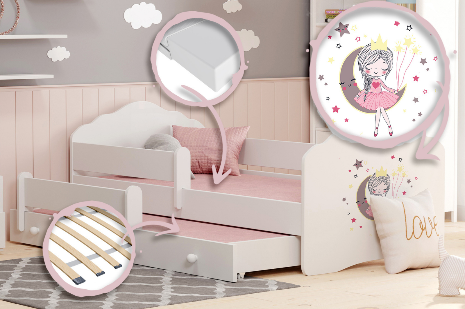 Łóżko FALA II to funkcjonalne i stylowe rozwiązanie do pokoju dziecięcego, łączące wygodę, bezpieczeństwo i praktyczność. Dzięki wysuwanemu dolnemu poziomowi, pojedyncze łóżko w łatwy sposób zamienia się w podwójne, co pozwala optymalnie wykorzystać przestrzeń – idealne dla rodzeństwa lub gości. Nowoczesny, minimalistyczny design mebla sprawia, że łóżko z łatwością wkomponuje się w różne style aranżacyjne. Łóżko białe z grafiką zapewnia dziecku bezpieczne miejsce do spania i zabawy, szybko stając się ulubionym meblem w pokoju.