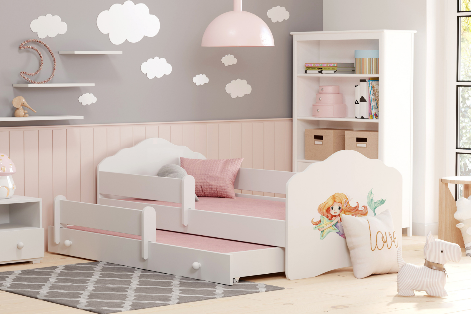 Łóżko FALA II to funkcjonalne i stylowe rozwiązanie do pokoju dziecięcego, łączące wygodę, bezpieczeństwo i praktyczność. Dzięki wysuwanemu dolnemu poziomowi, pojedyncze łóżko w łatwy sposób zamienia się w podwójne, co pozwala optymalnie wykorzystać przestrzeń – idealne dla rodzeństwa lub gości. Nowoczesny, minimalistyczny design mebla sprawia, że łóżko z łatwością wkomponuje się w różne style aranżacyjne. Łóżko białe z grafiką zapewnia dziecku bezpieczne miejsce do spania i zabawy, szybko stając się ulubionym meblem w pokoju.